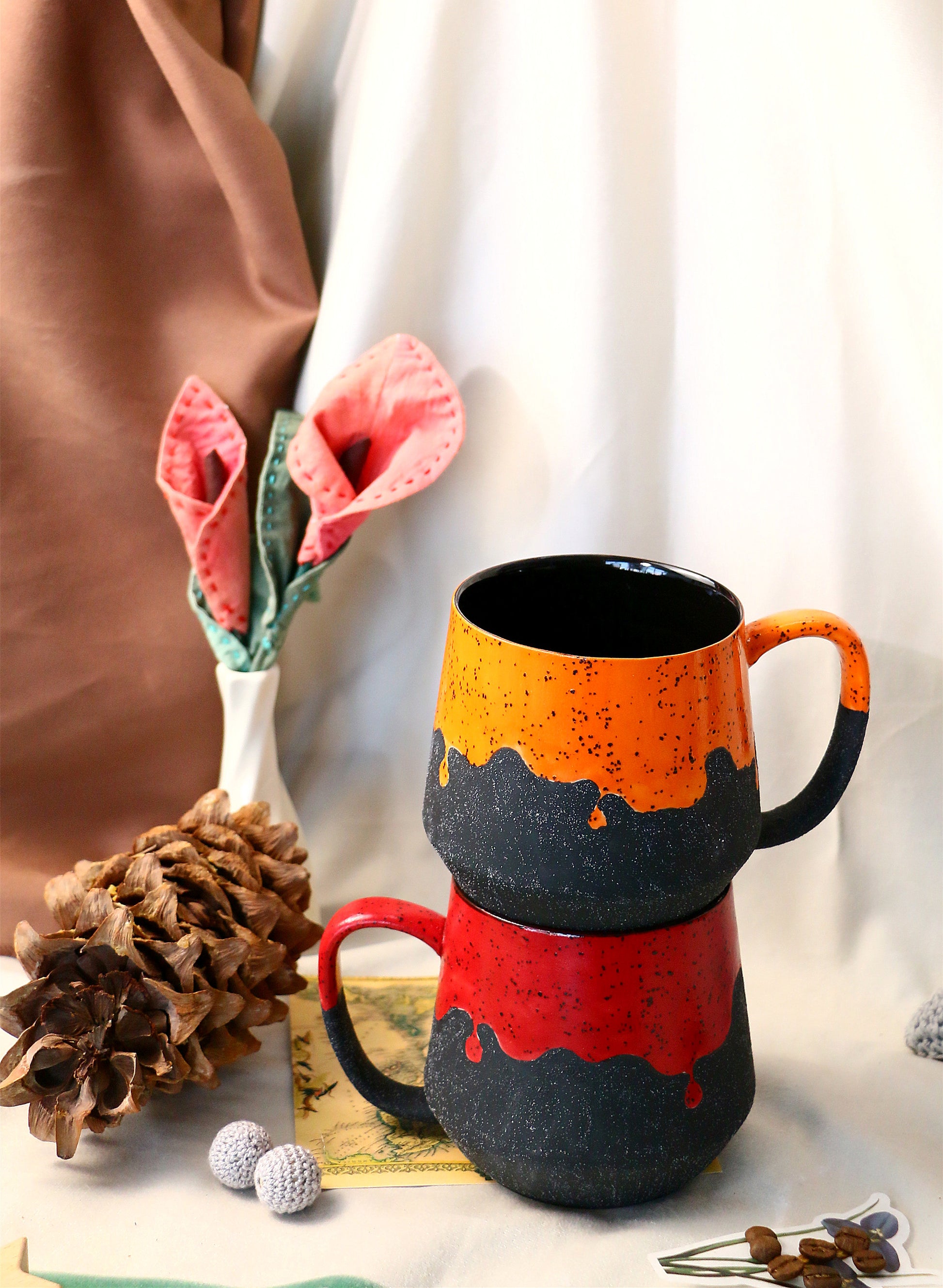 ☕️ أضف لمسة فنية جريئة إلى مجموعة أدوات الشرب الخاصة بك مع هذا الكوب الخزفي المصنوع يدويًا! يتميز بتصميم فريد من نوعه بطلاء التنقيط بلون برتقالي ناري وأحمر غامق على قاعدة سوداء منقوشة، وهو مثالي لعشاق القهوة والشاي والشوكولاتة الساخنة. تباين ألوانه الأخّاذ يجعله قطعة مميزة لأي مطبخ عصري أو ريفي.