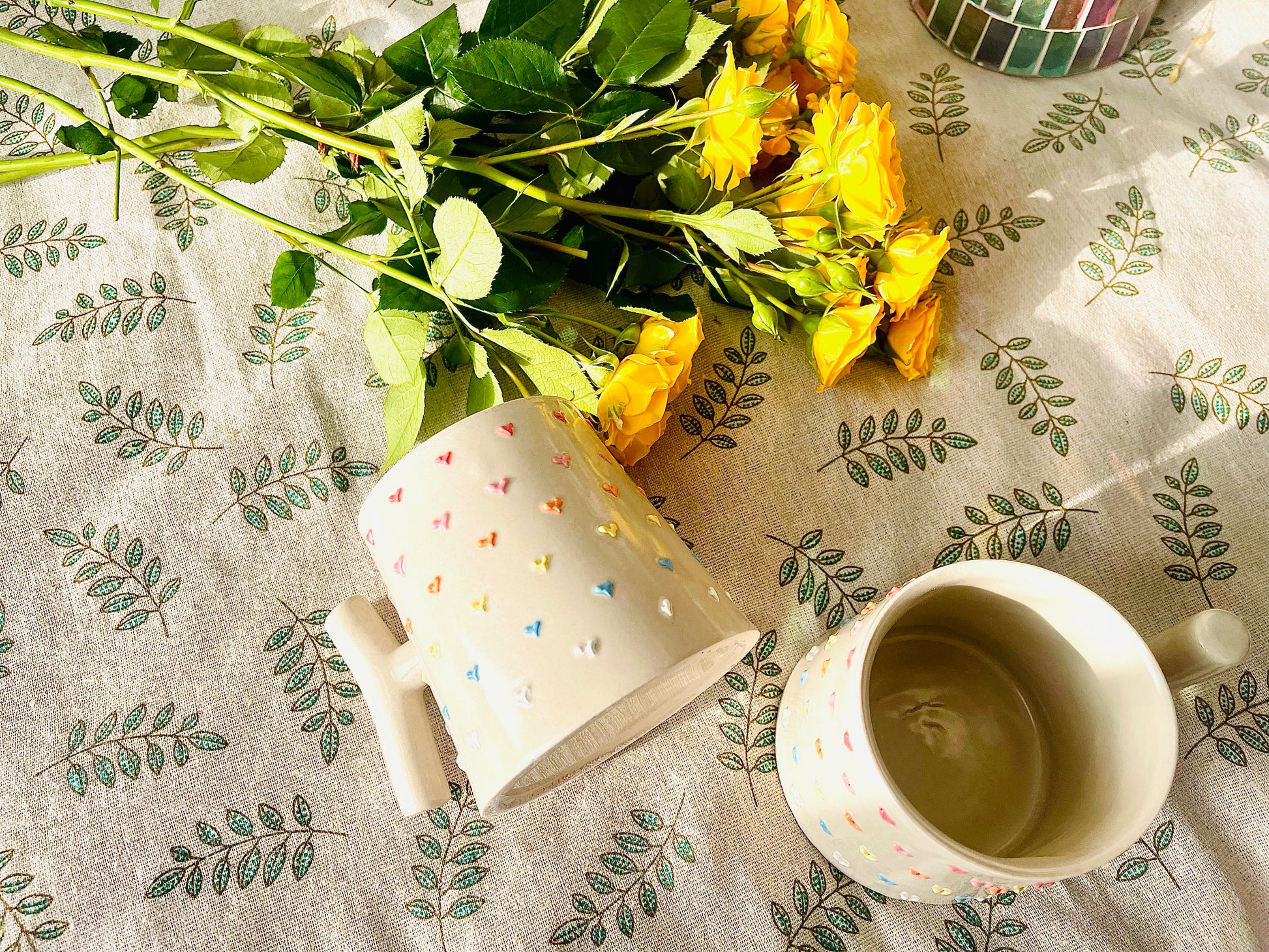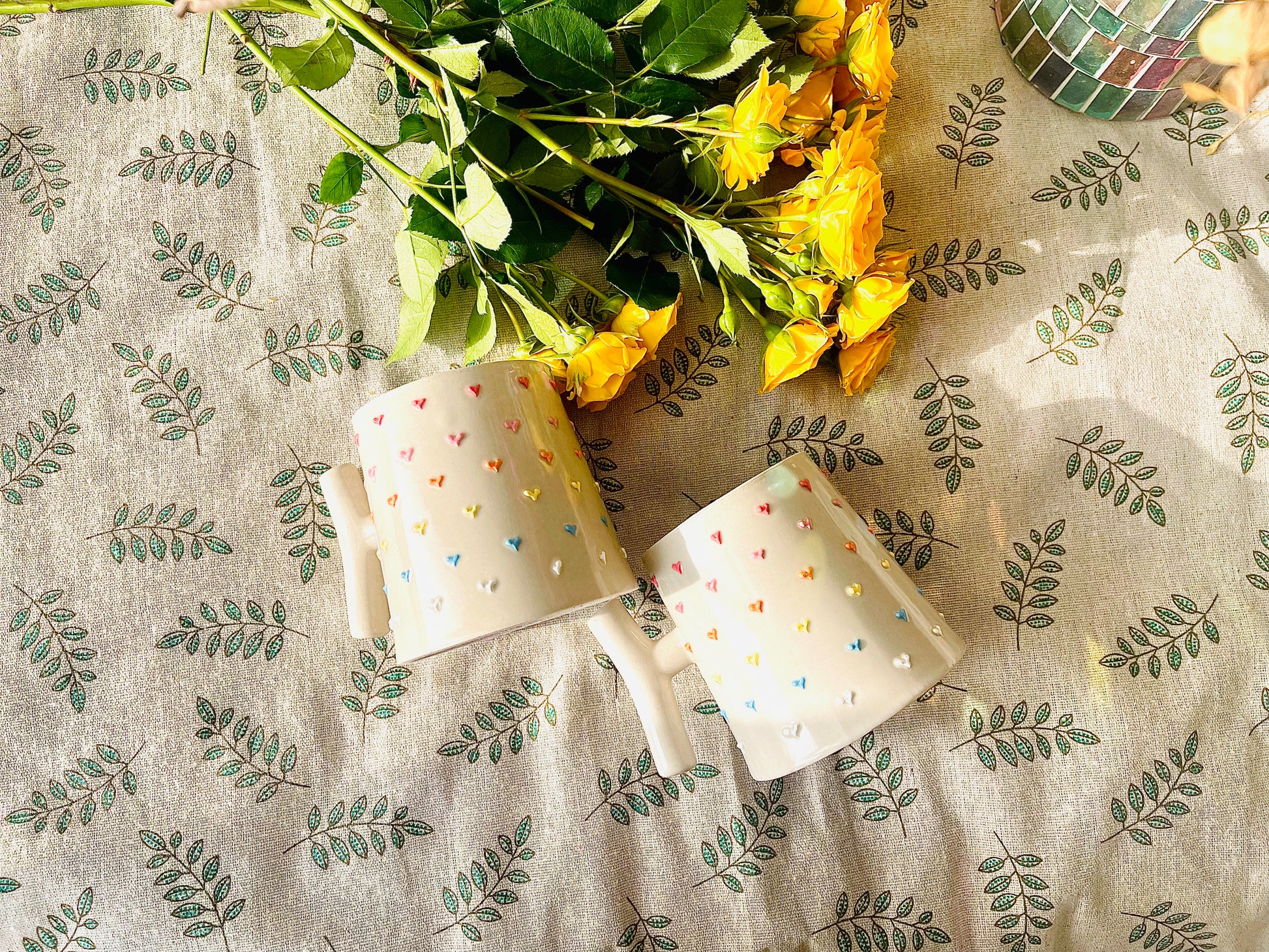 ✨ كوبٌ مفعمٌ بالحب والإبداع! يتميز هذا الكوب الخزفي المصنوع يدويًا بمقبض فريد على شكل حرف T يضفي لمسةً عصريةً وفنية، مع قلوب ملونة ثلاثية الأبعاد مرسومة يدويًا تُضفي عليه ملمسًا جذابًا وسحرًا. يتناغم الطلاء الناعم والمحايد بشكلٍ رائع مع القلوب النابضة بالحياة، مما يجعله مزيجًا مثاليًا من الأناقة والمرح. صُمم هذا الكوب ليمنحك الراحة والأناقة، وهو مثاليٌّ للقهوة أو الشاي أو الشوكولاتة الساخنة.