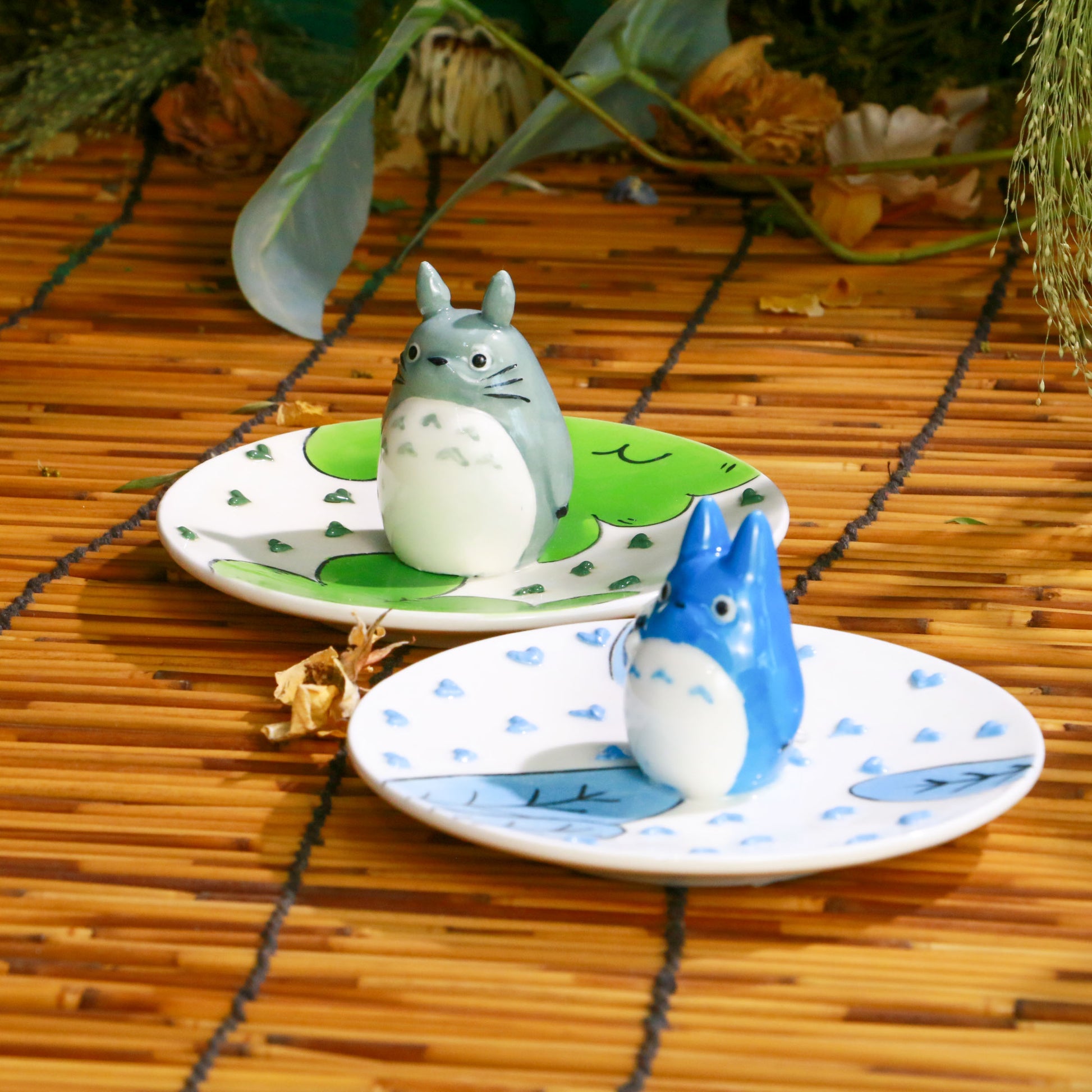 نقدم لكم طبق مجوهرات توتورو الرائع، تحفة فنية مصنوعة يدويًا، مصممة لإضفاء لمسة ساحرة على مساحتكم! متوفر بخيارين رائعين، يمكنكِ الاختيار بين توتورو أزرق هادئ أو رمادي جذاب، متوضع برشاقة في وسط الطبق. يحيط بهذه الشخصيات الساحرة نمط مرسوم يدويًا بدقة من أوراق الشجر الوارفة، مما يضفي شعورًا بالخيال وجمال الطبيعة.