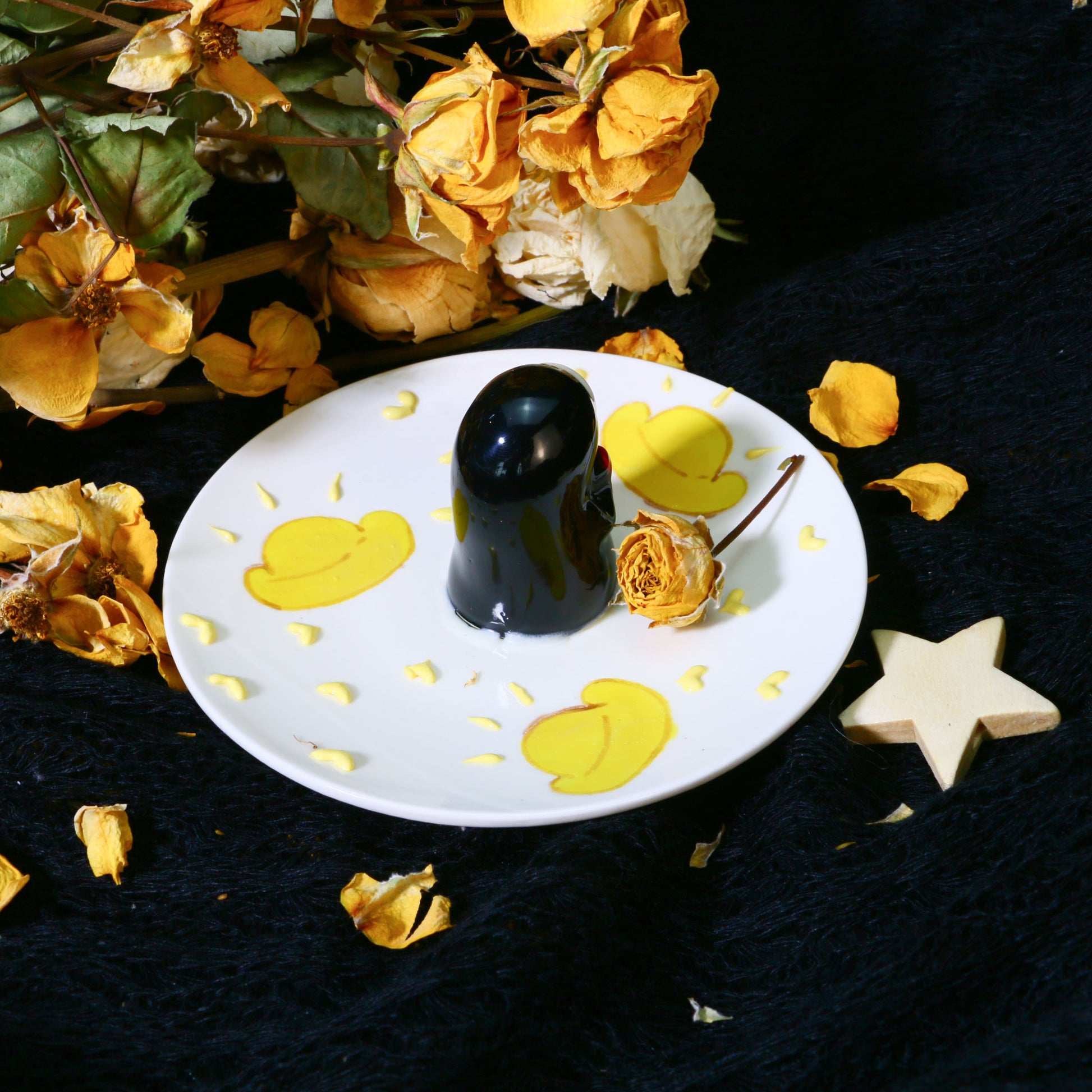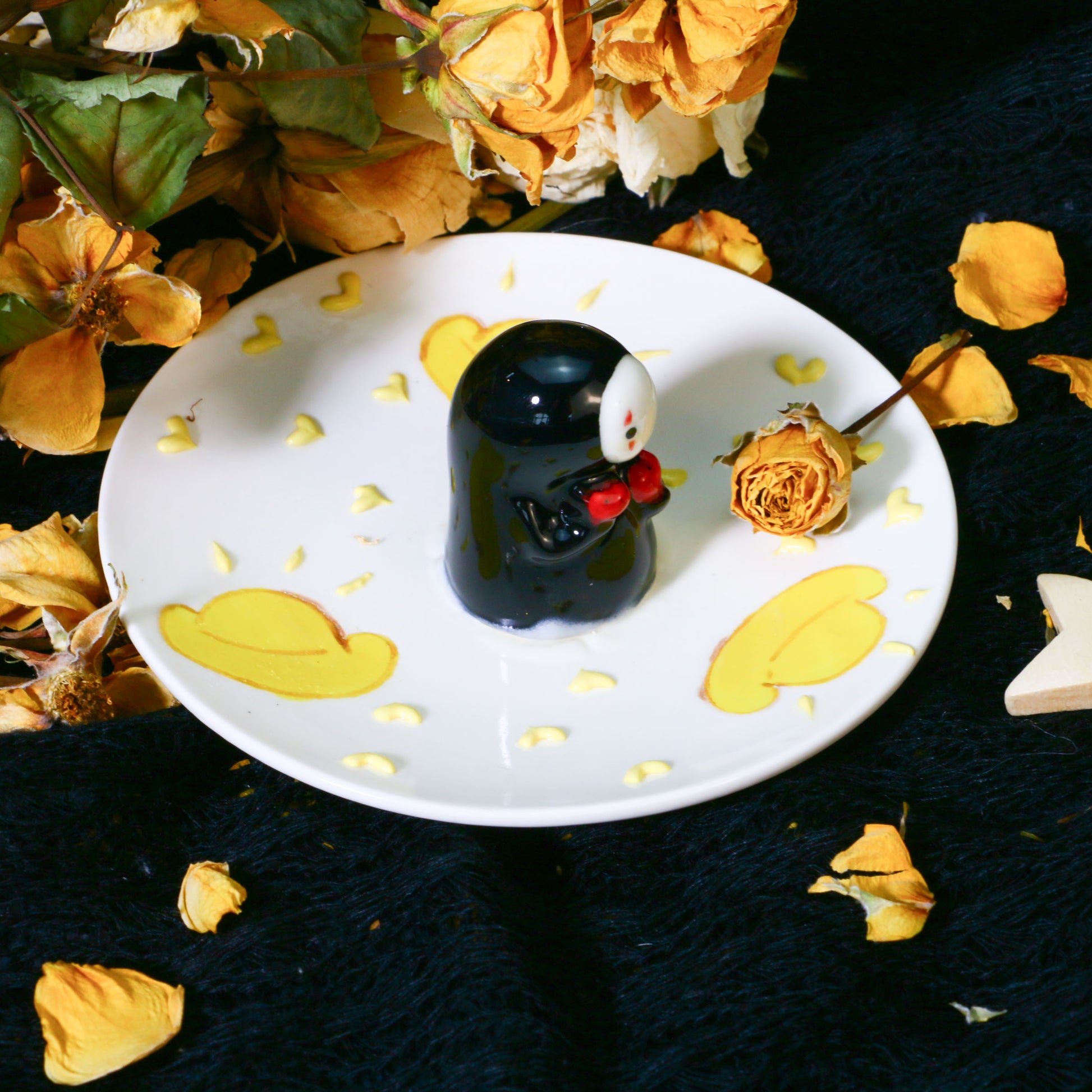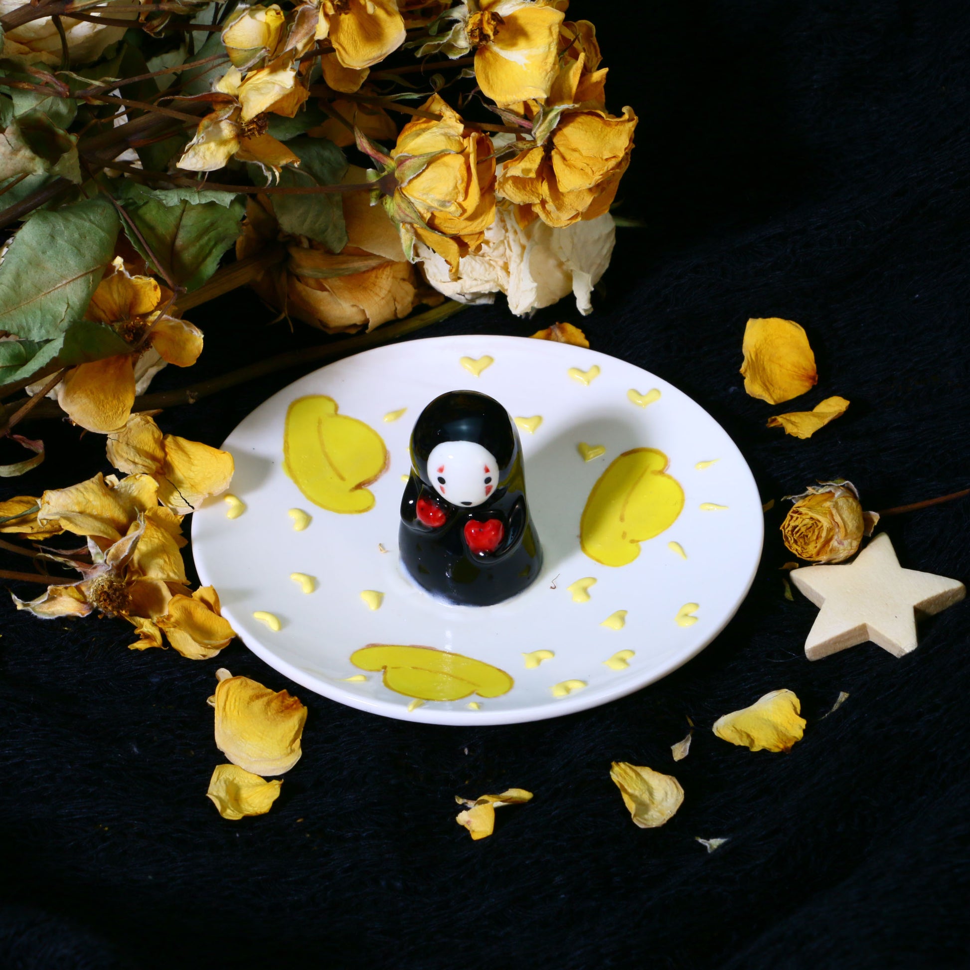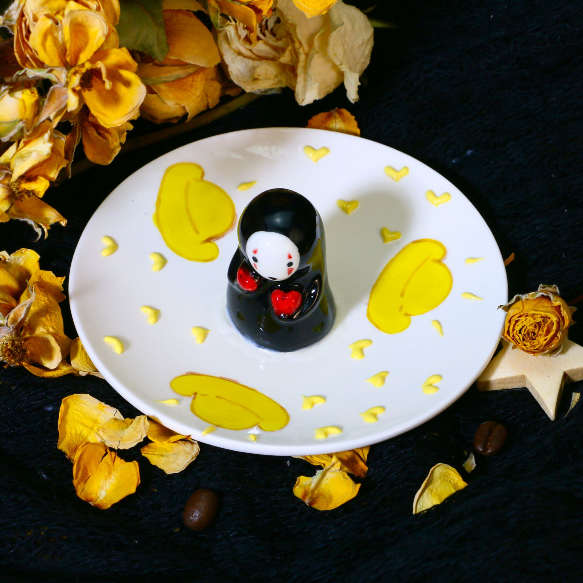 تعرّف على الطبق الأكثر غرابة على رفّك - طبق خزفي مصنوع يدويًا، يتوسطه شخصية صغيرة ترتدي عباءة، تجلس بسلام، تحمل قلبين أحمرين ❤️. محاطة بسبائك ذهبية وقلوب مصغّرة، تضفي هذه القطعة سحرًا مرحًا ورمزيًا على أي مساحة.