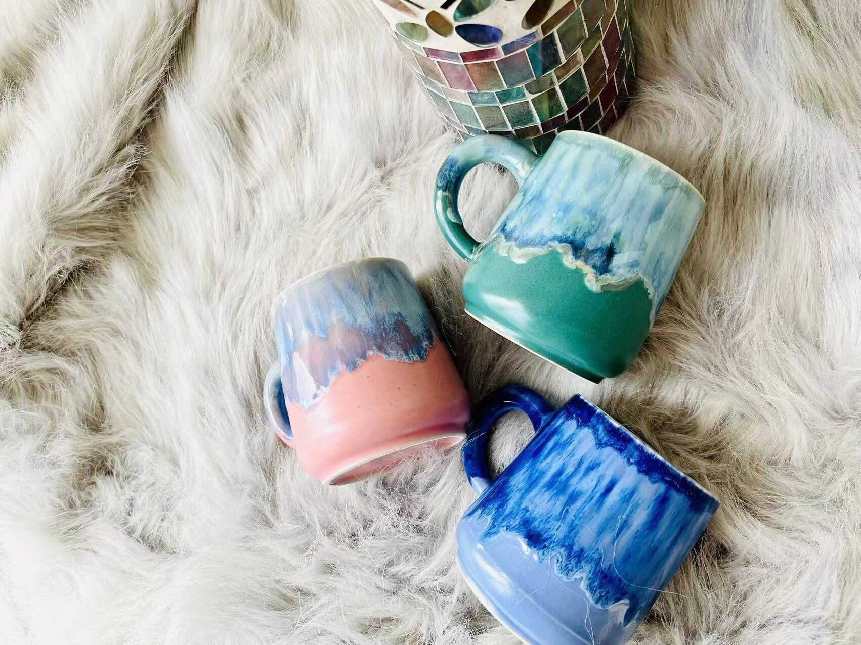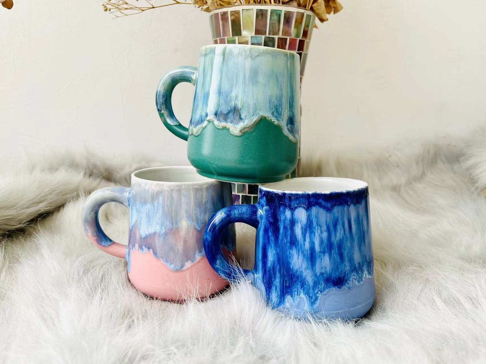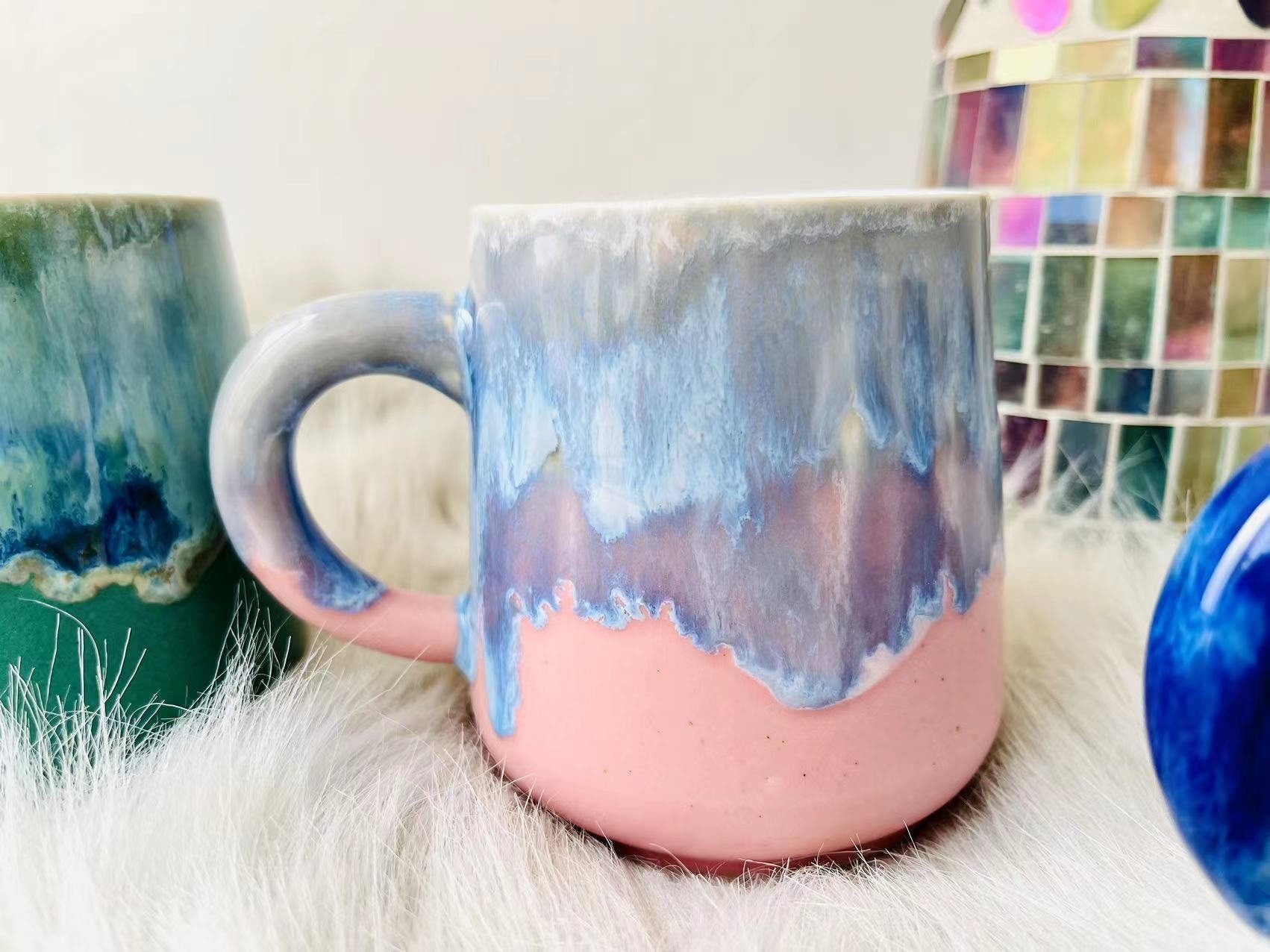 كوب قهوة سيراميكي بألوان قوس قزح مصنوع يدويًا، 14 أونصة، كوب فخاري مخصص باللونين الوردي والأخضر