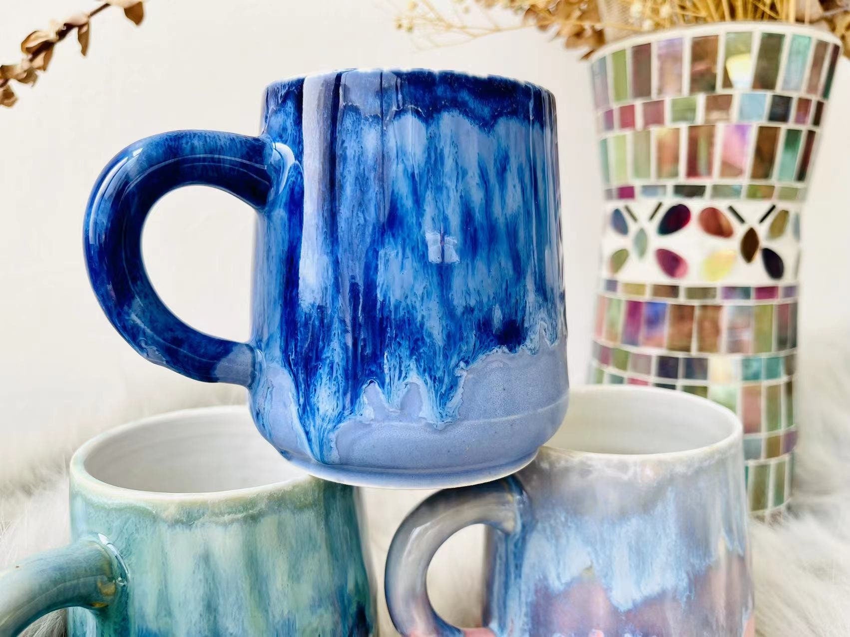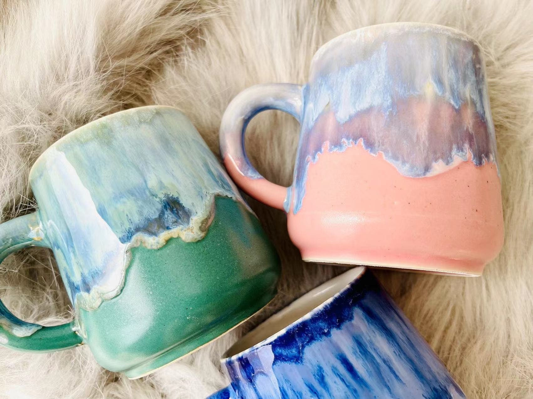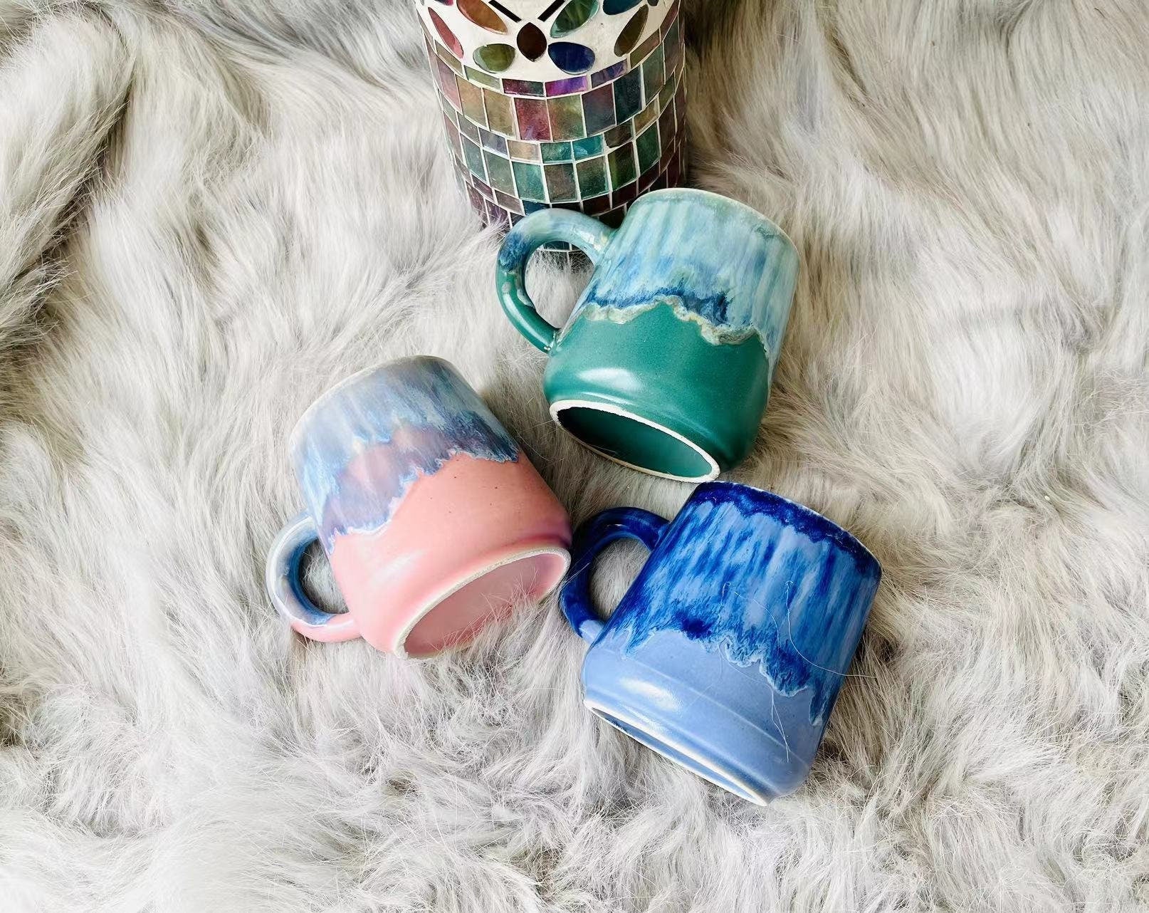 كوب قهوة سيراميكي بألوان قوس قزح مصنوع يدويًا، 14 أونصة، كوب فخاري مخصص باللونين الوردي والأخضر