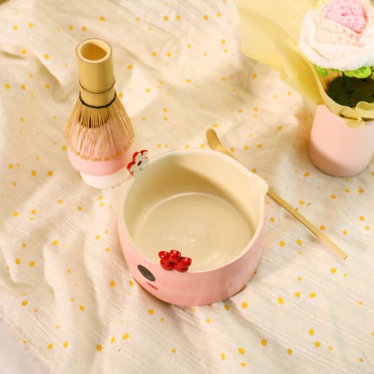 Handmade Pink Matcha Bowl Set, Cute Flower Ears for Matcha Lovers