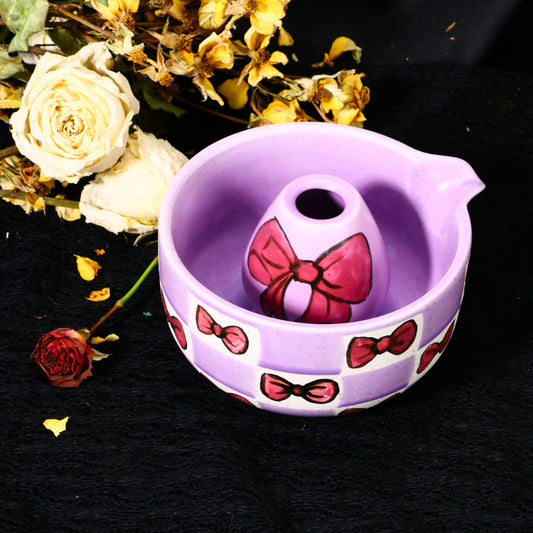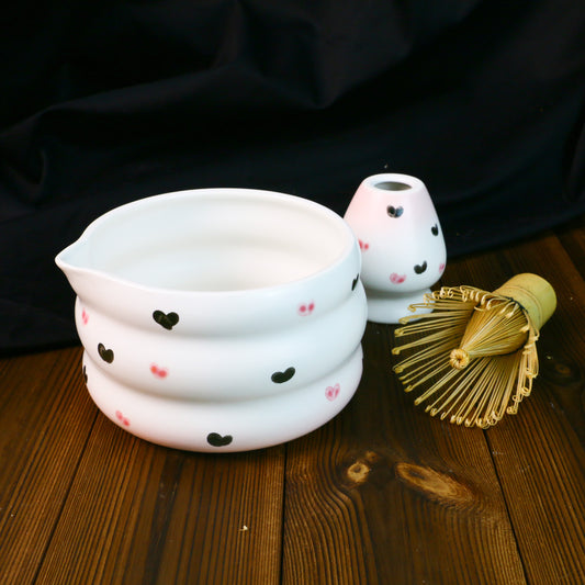 Handmade Ceramic Matcha Bowl Set with Hand-Painted Ribbon Details