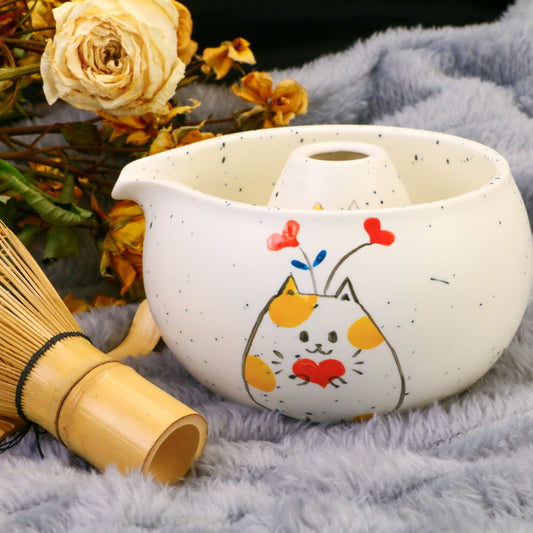 Hand-Painted Cat Matcha Bowl Set, Pottery White Chawan with Heart Kitty Design