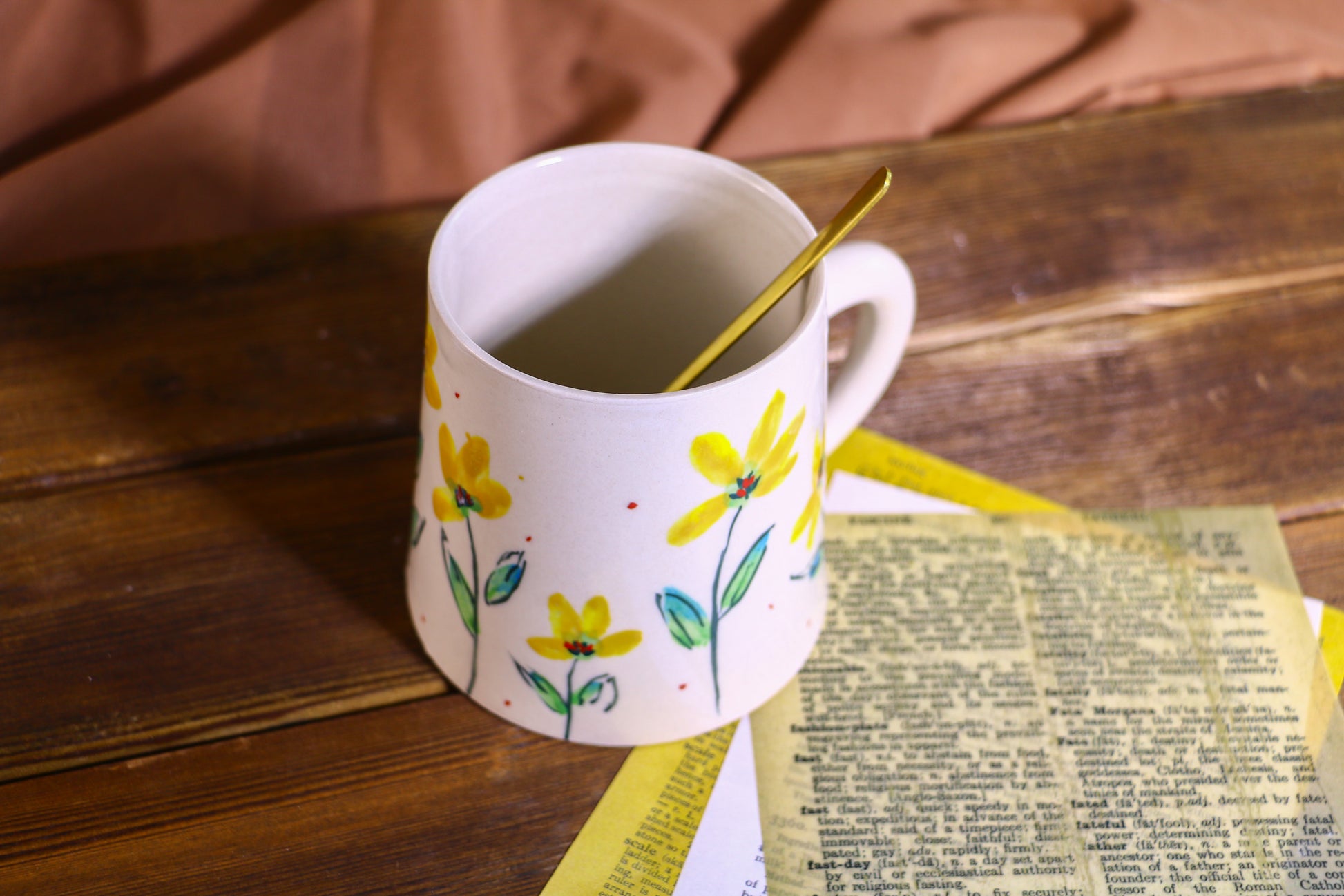 🌼 Verleihen Sie Ihrer Tee- oder Kaffeezeit mit dieser handgefertigten Keramiktasse einen Hauch von Charme und Eleganz. Mit ihrem wunderschönen handgemalten Blumenmotiv ist diese Tasse der perfekte Ort, um Ihr Lieblingsgetränk zu genießen. Mit ihrem individuell anpassbaren Design ist diese Tasse ein aufmerksames Geschenk für Teeliebhaber oder alle, die einzigartige, handgefertigte Keramik mögen. Ob Sie sich für das blaue oder gelbe Blumenmuster entscheiden, jede Tasse wird mit Sorgfalt und Liebe zum Detail gefertigt.