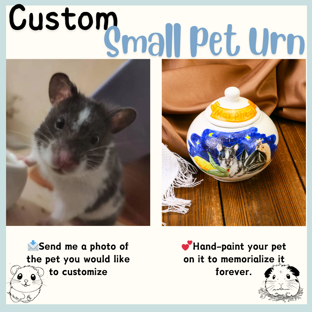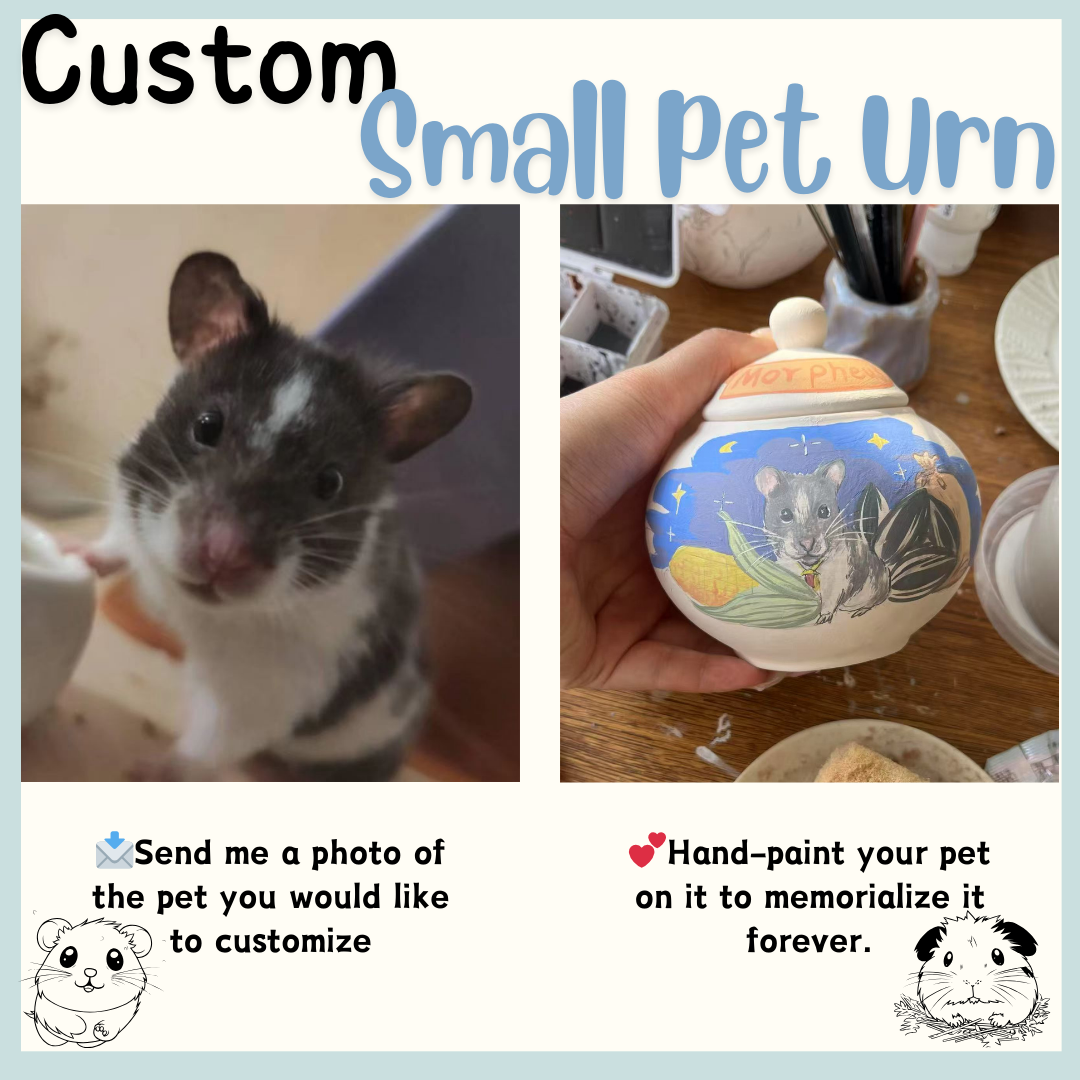 💕Honor your beloved small pet with a one-of-a-kind handmade urn. Specially crafted for hamsters, guinea pigs, mice, rats, and other tiny companions, this ceramic urn features a custom hand-painted portrait of your pet based on your photo. Each piece is created with care, offering a beautiful way to cherish their memory forever.