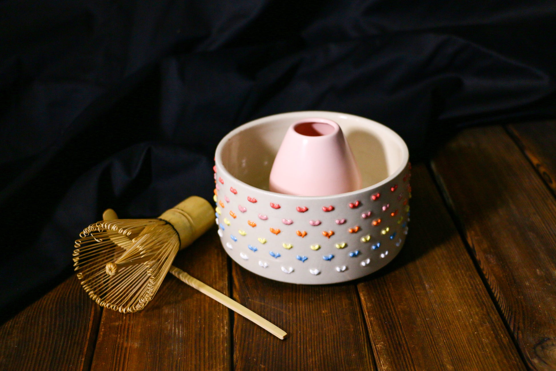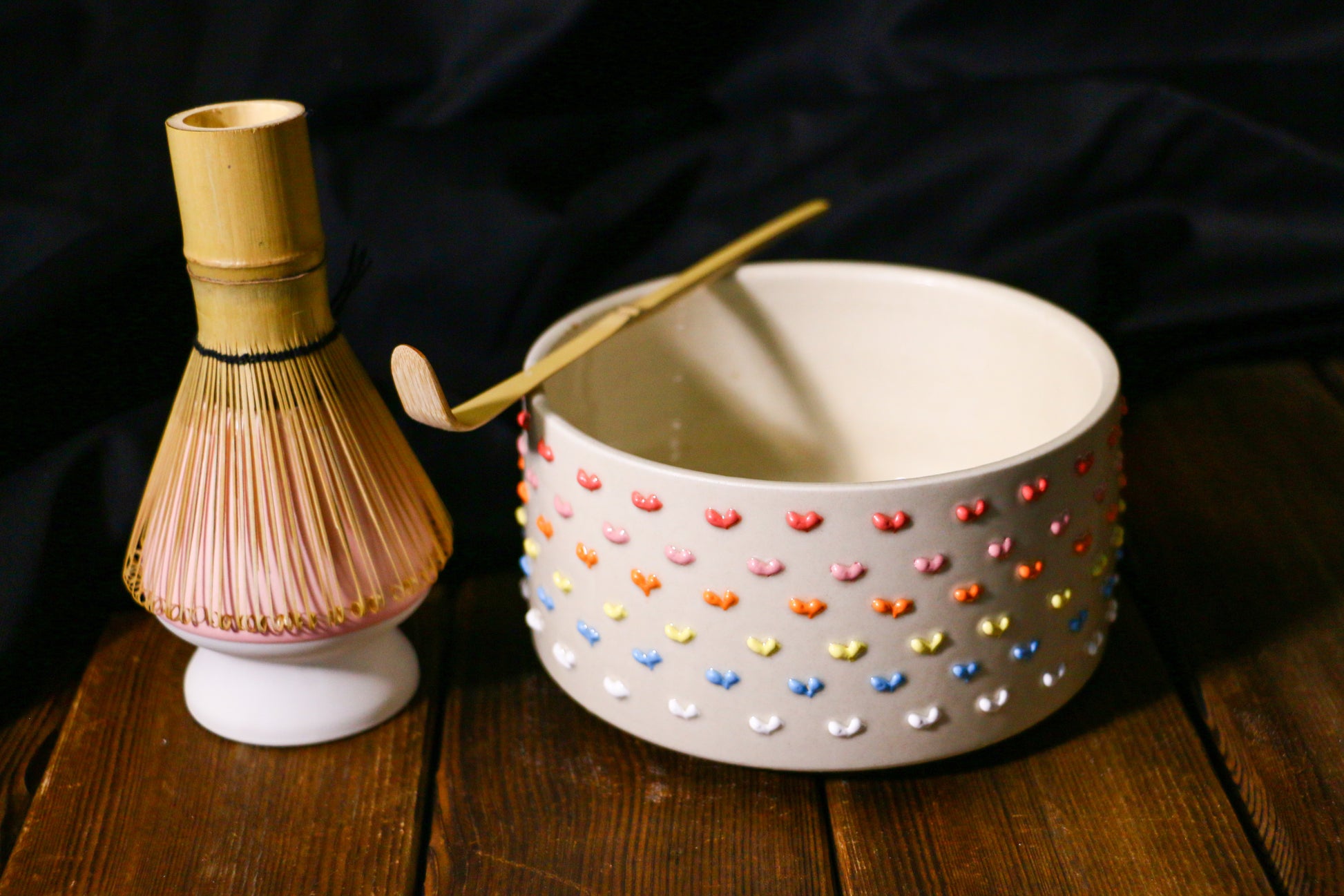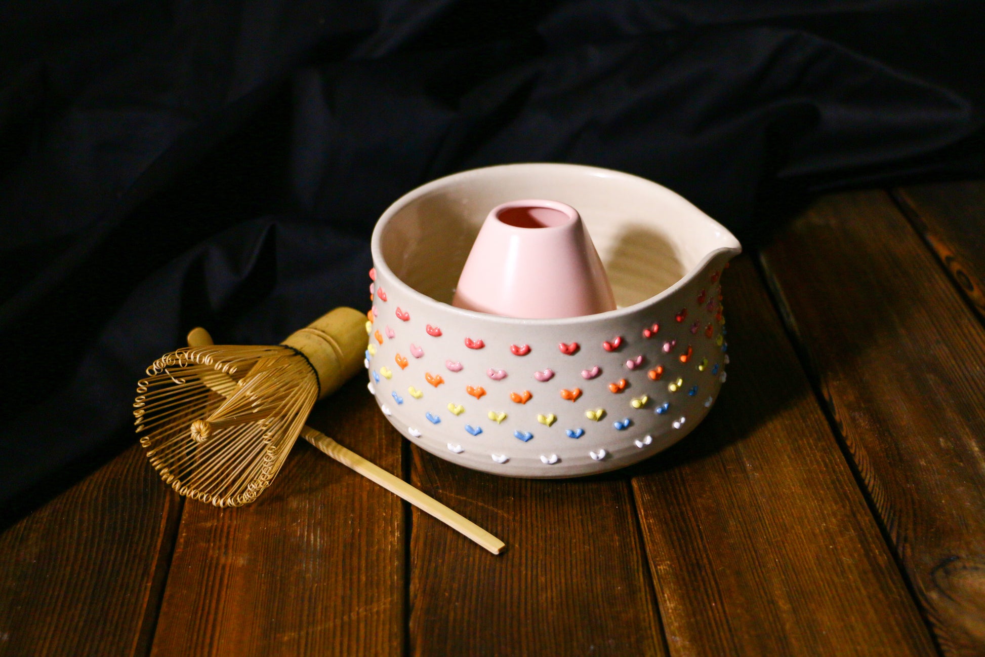 Kawaii Ceramic Matcha Bowl with Handmade 3D Colorful Hearts Design