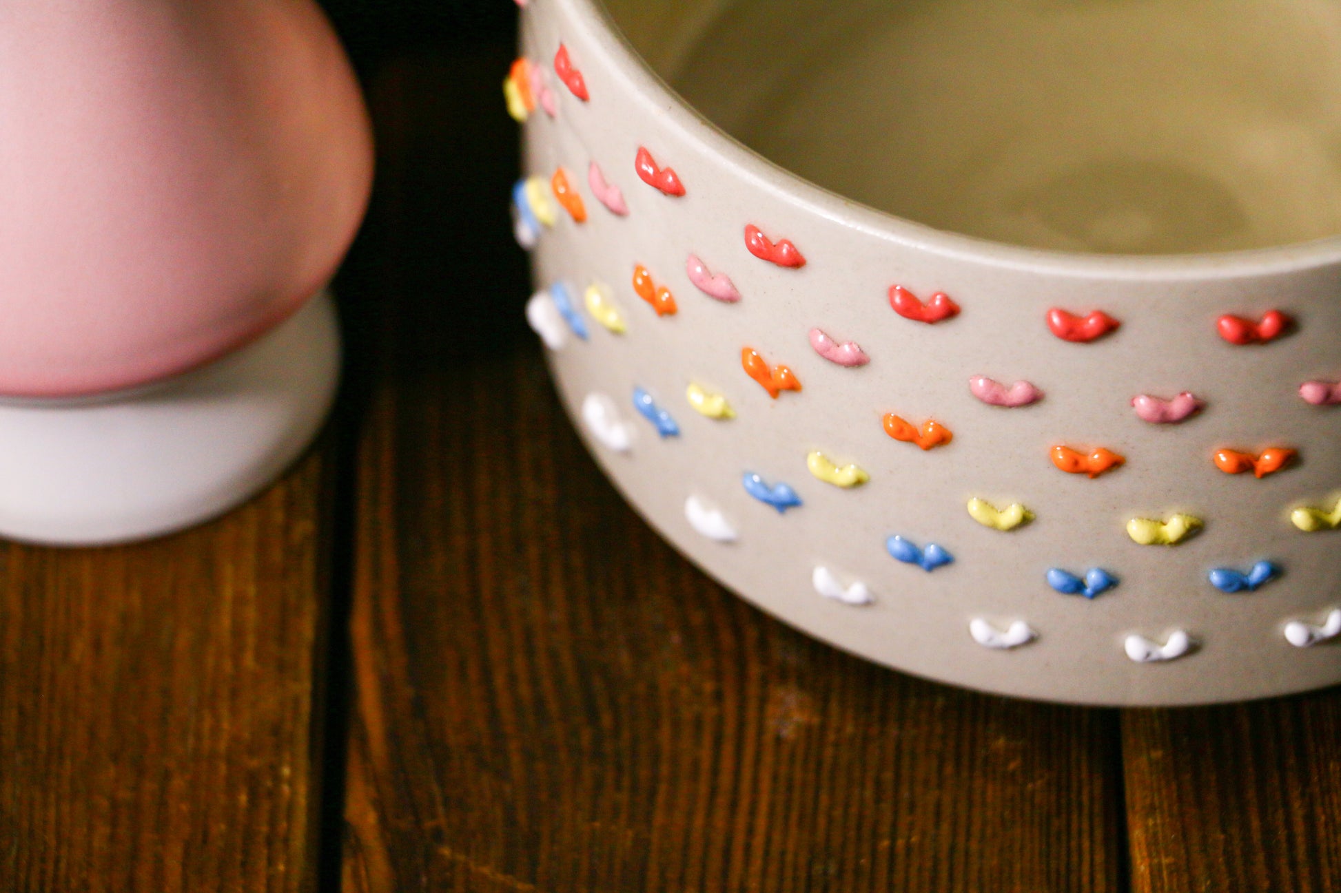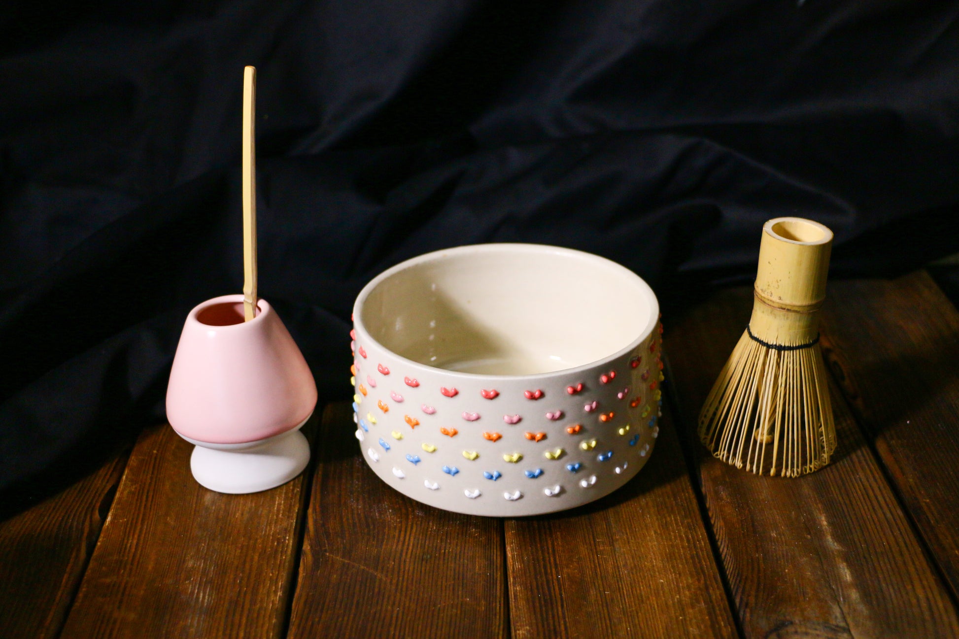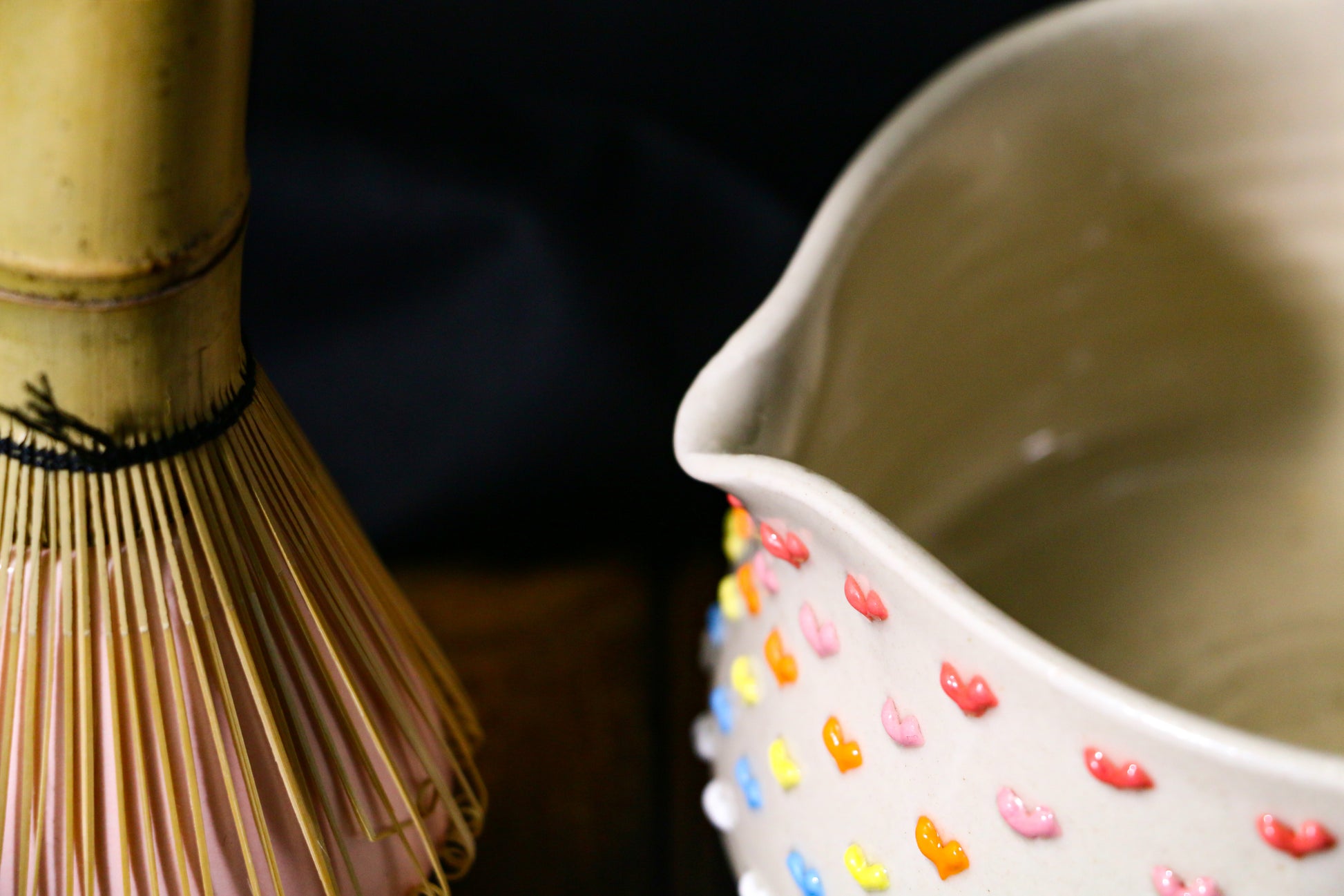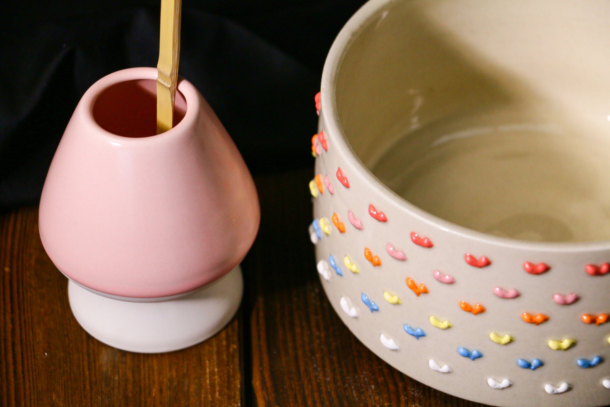 Kawaii Ceramic Matcha Bowl with Handmade 3D Colorful Hearts Design