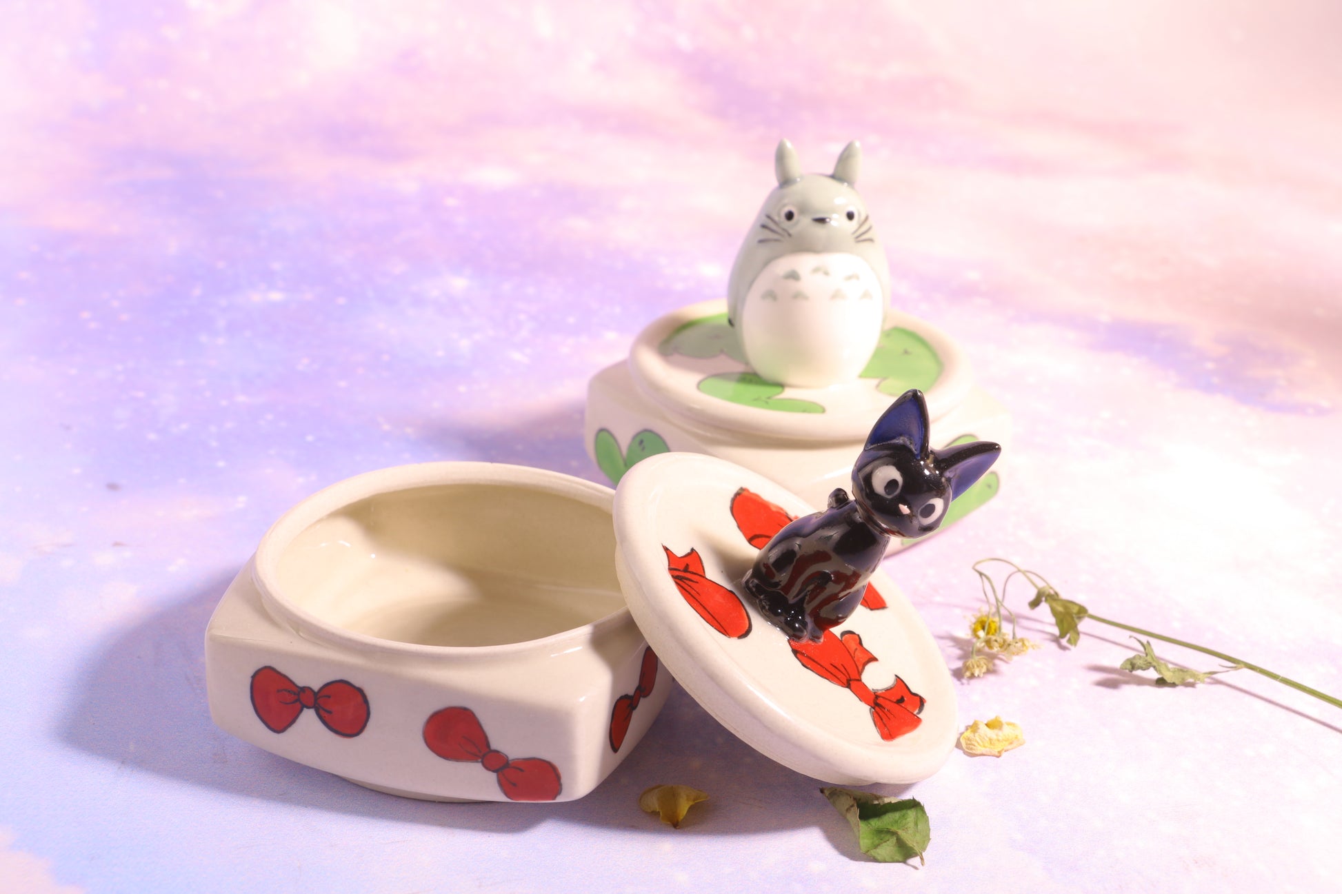 🕊️ The first style boasts a surface adorned with vibrant red bows, reminiscent of the iconic ribbons worn by Mei and Satsuki in the beloved Studio Ghibli film. Adding a whimsical touch, the lid of this urn is adorned with a miniature Jiji sculpture, serving as a delightful handle for opening the lid and revealing its contents.