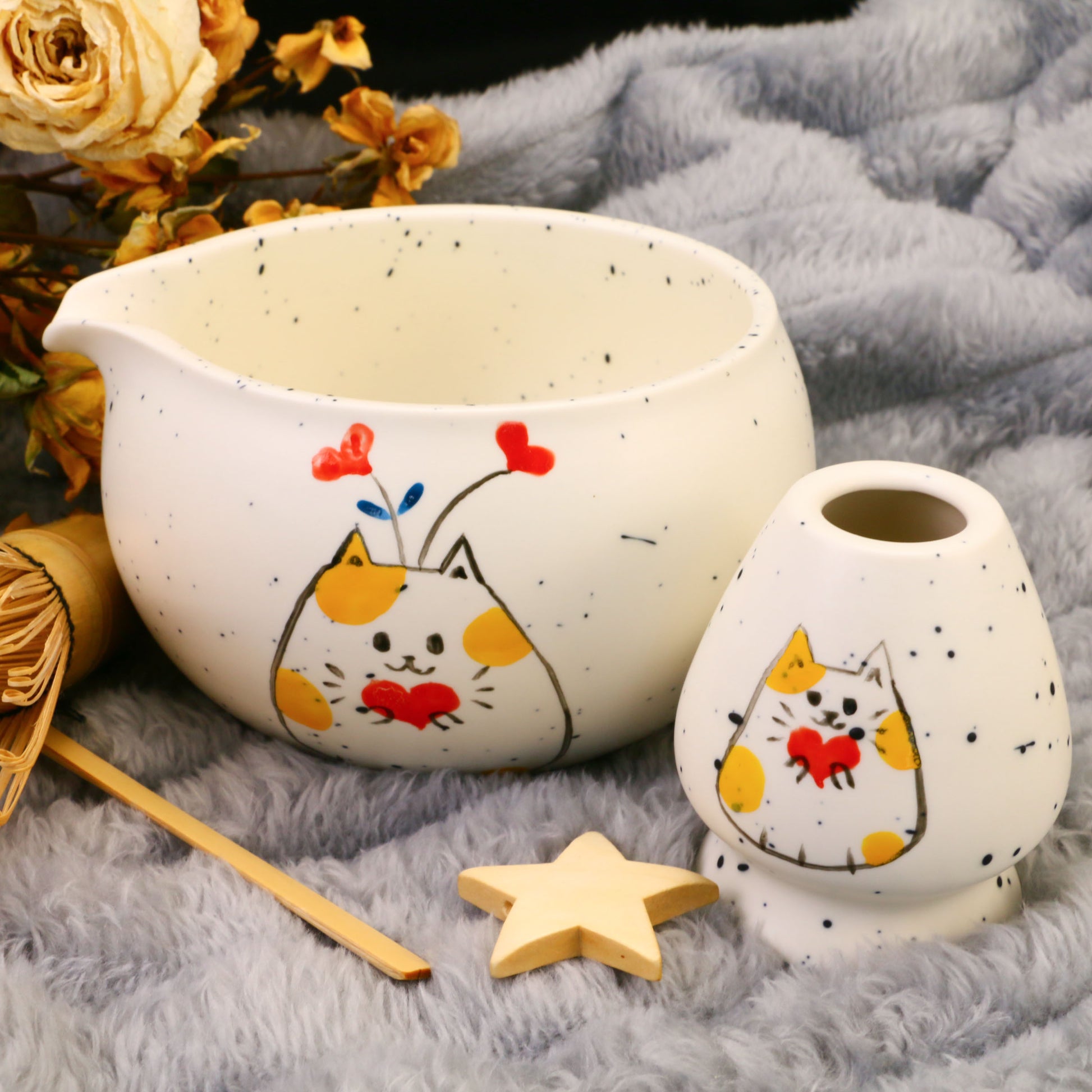 Hand-Painted Cat Matcha Bowl Set, Pottery White Chawan with Heart Kitty Design