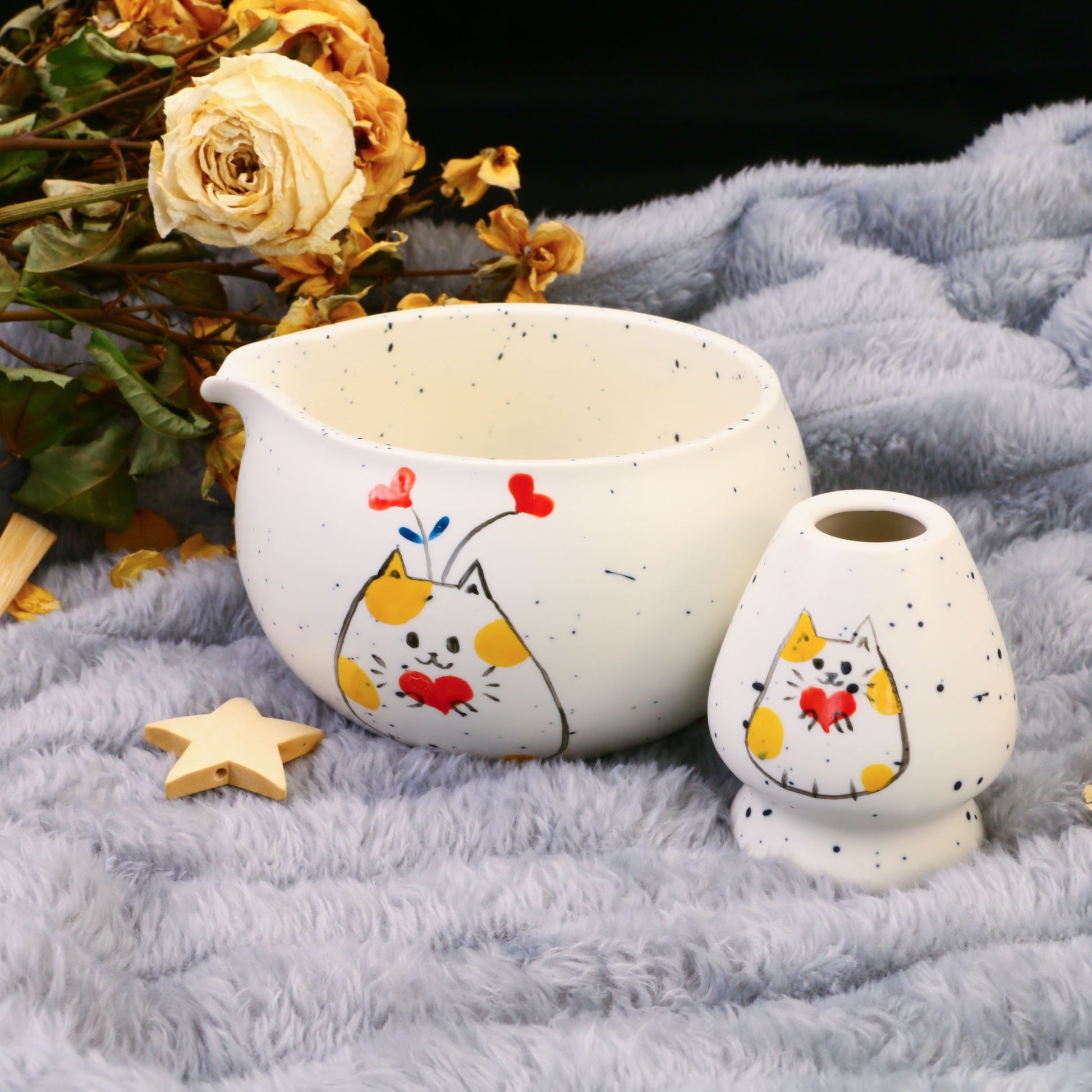 🐱 This adorable handmade matcha bowl set features a chubby kitty holding a red heart, with blooming heart flowers on its head — the perfect blend of sweetness and tradition. Crafted in a charming speckled ceramic finish, each piece is hand-painted and unique.