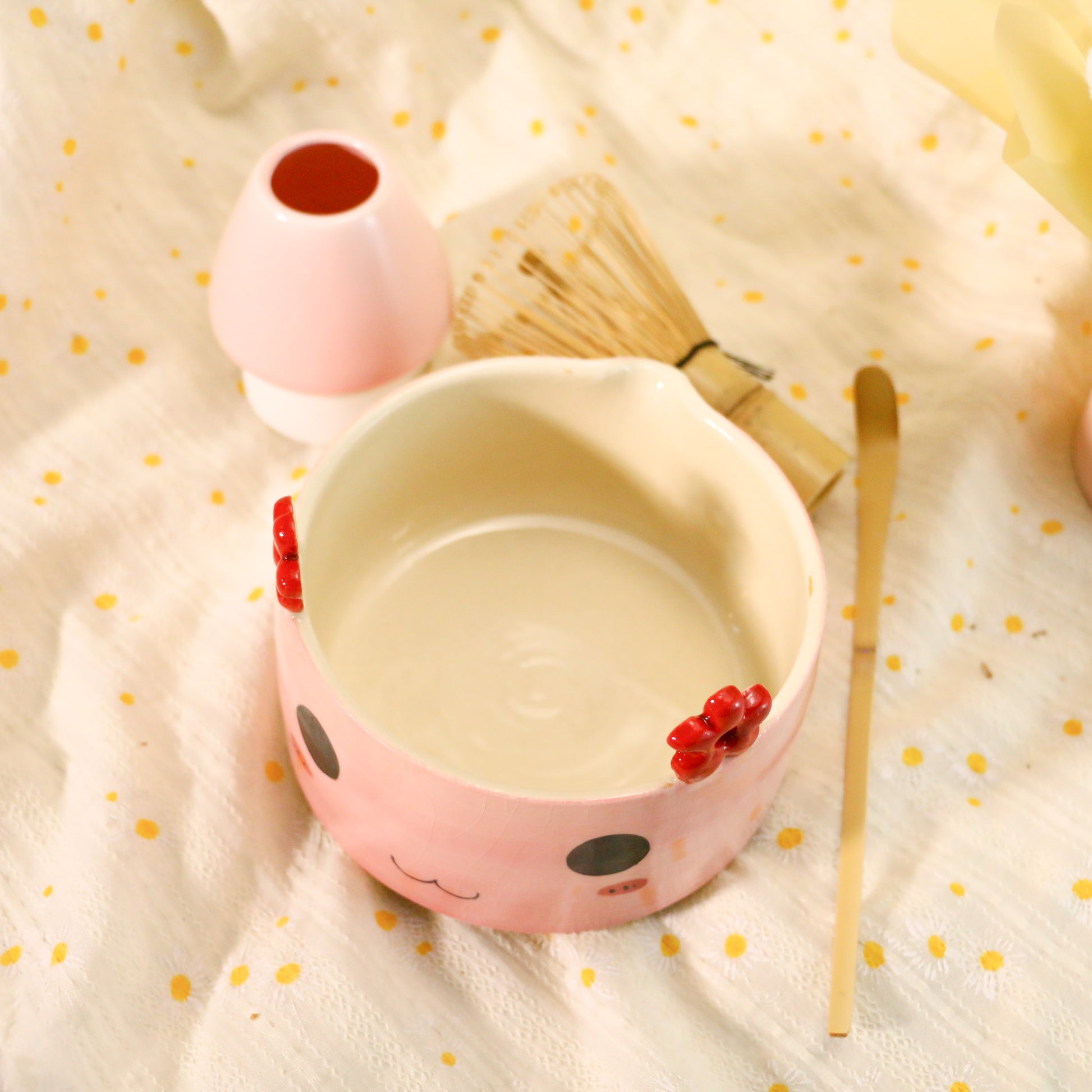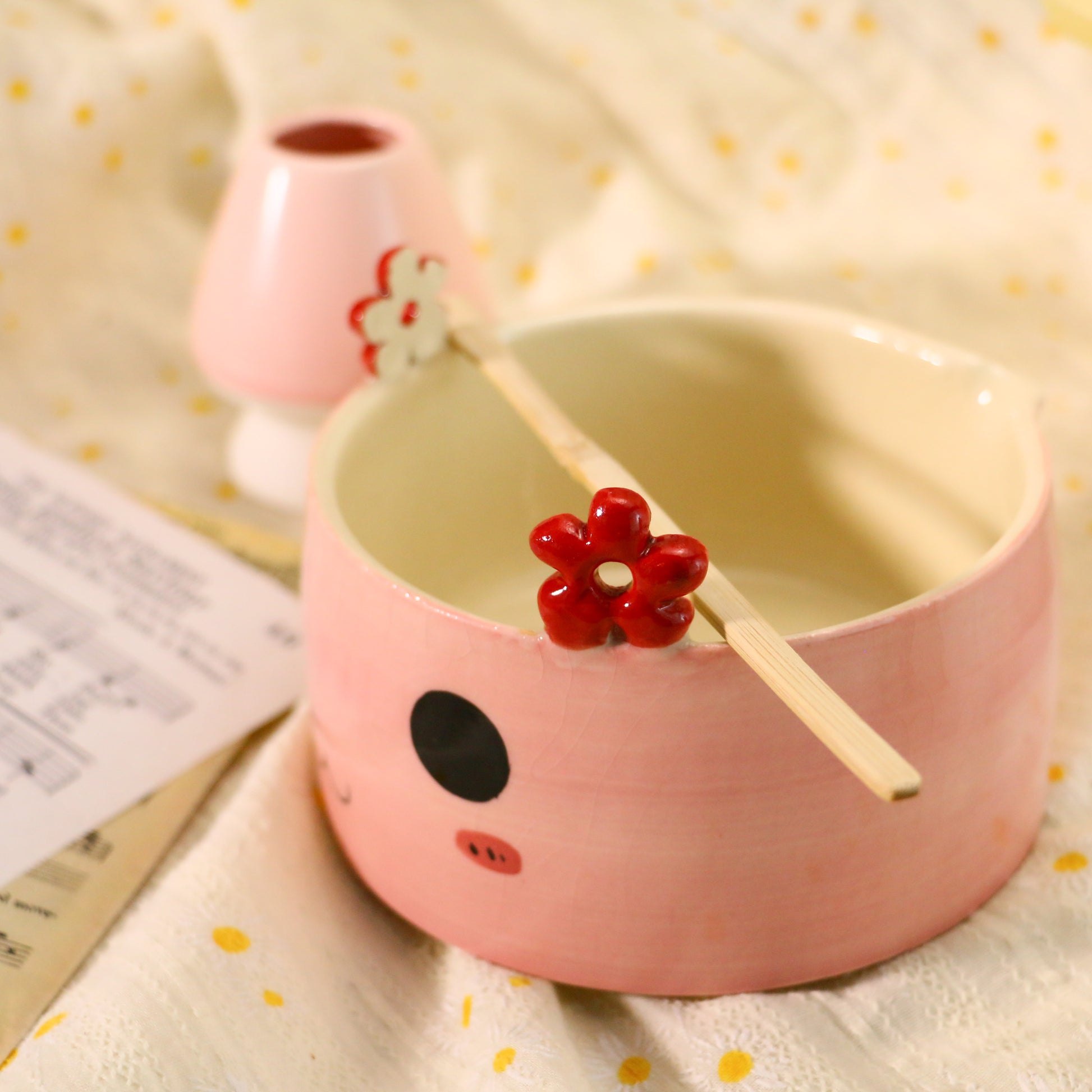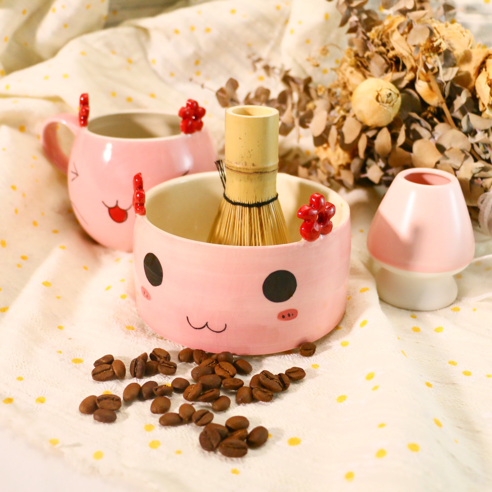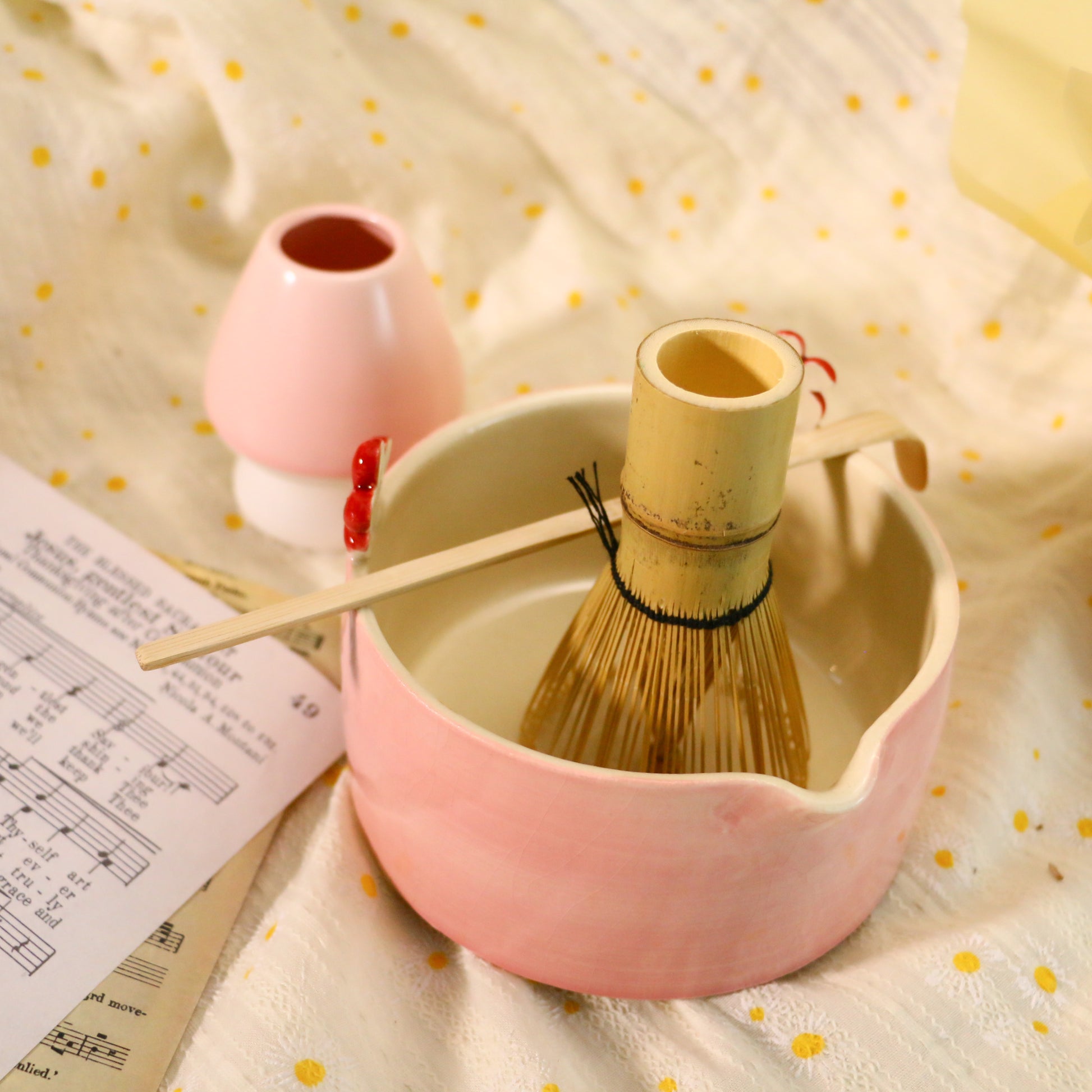 Handmade Pink Matcha Bowl Set, Cute Flower Ears for Matcha Lovers