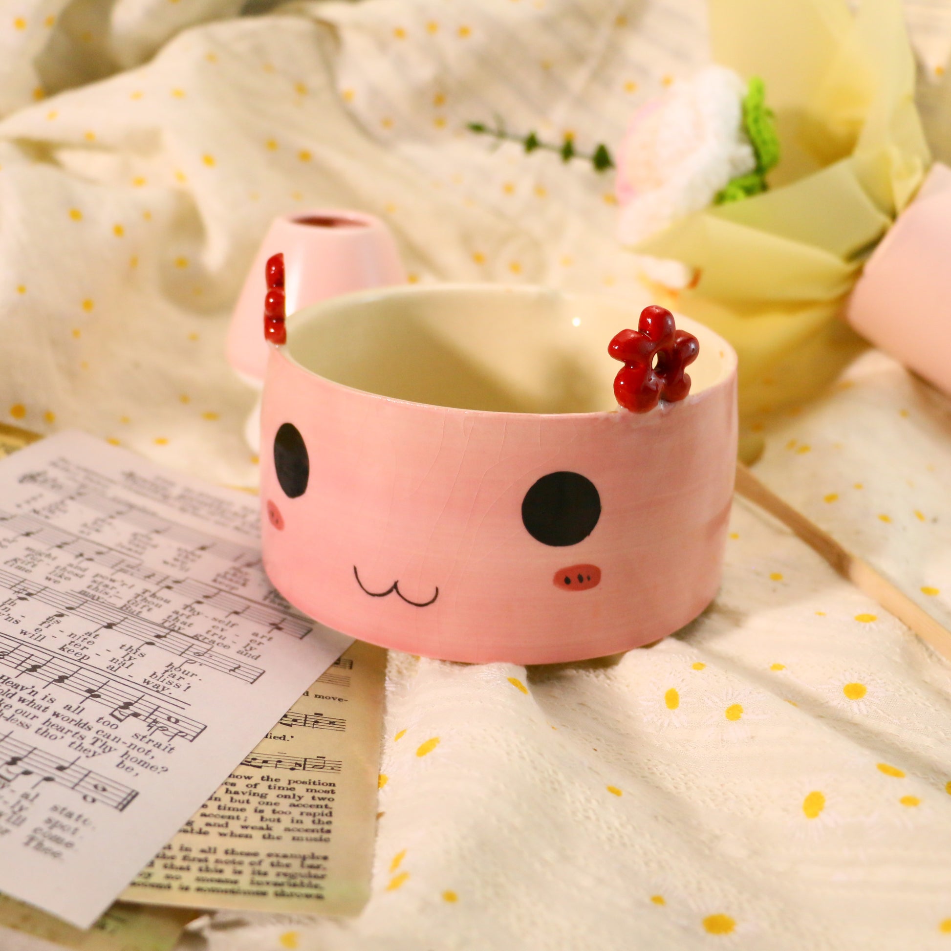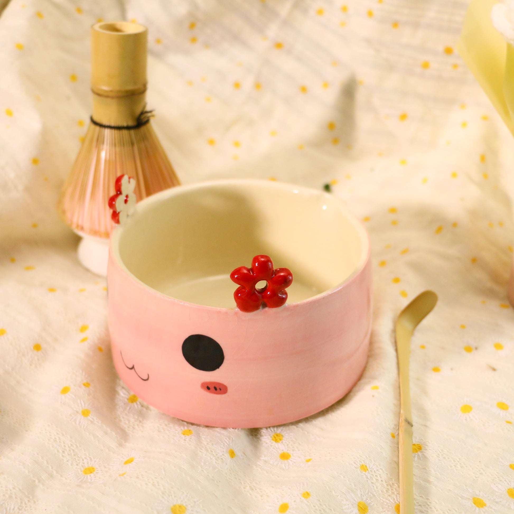 🍵 Make your matcha ritual extra fun and adorable with this handmade kawaii matcha bowl! Designed in a soft pastel pink glaze with a smiling face, rosy cheeks, and two flower-shaped "ears", this bowl is perfect for tea lovers who appreciate both functionality and cute design.