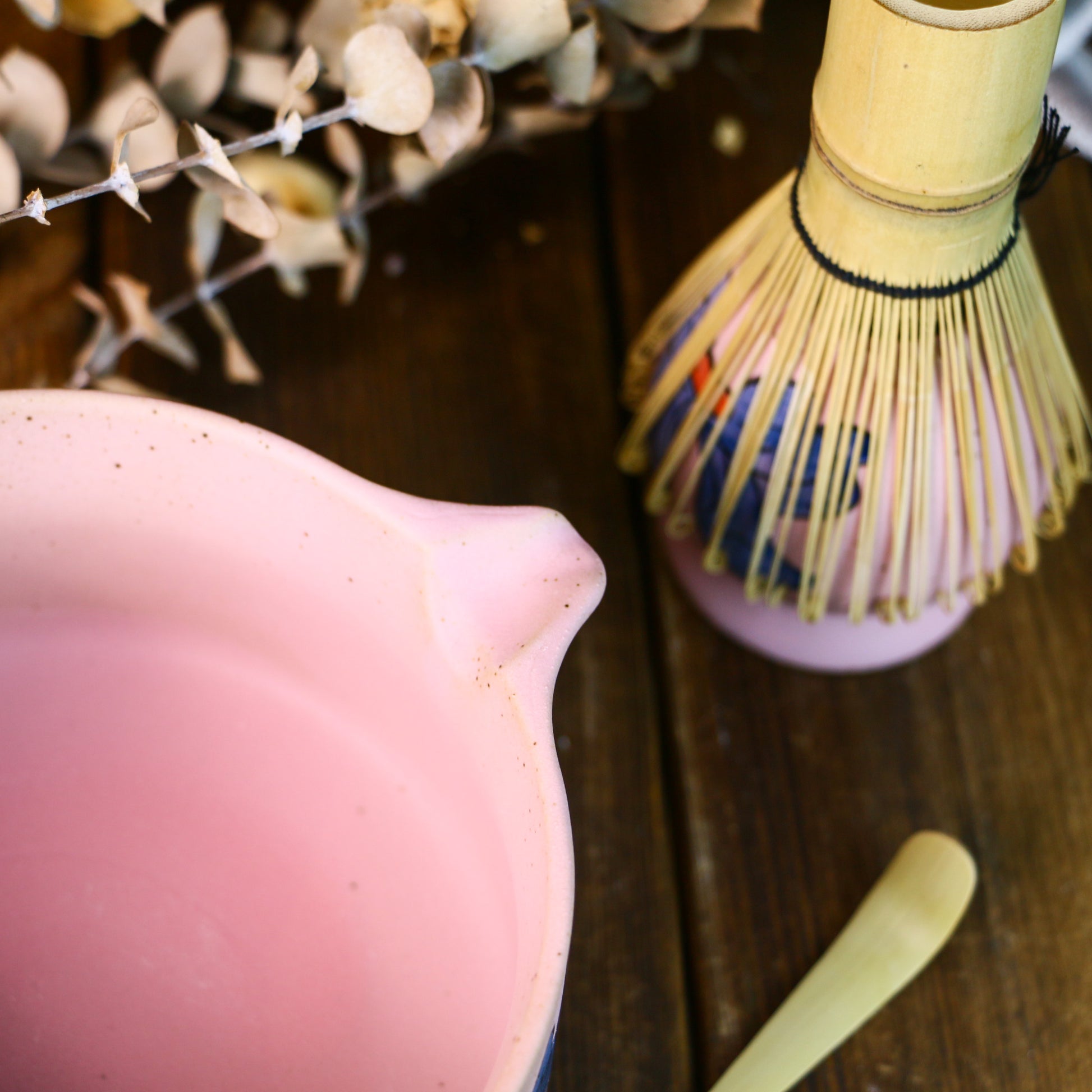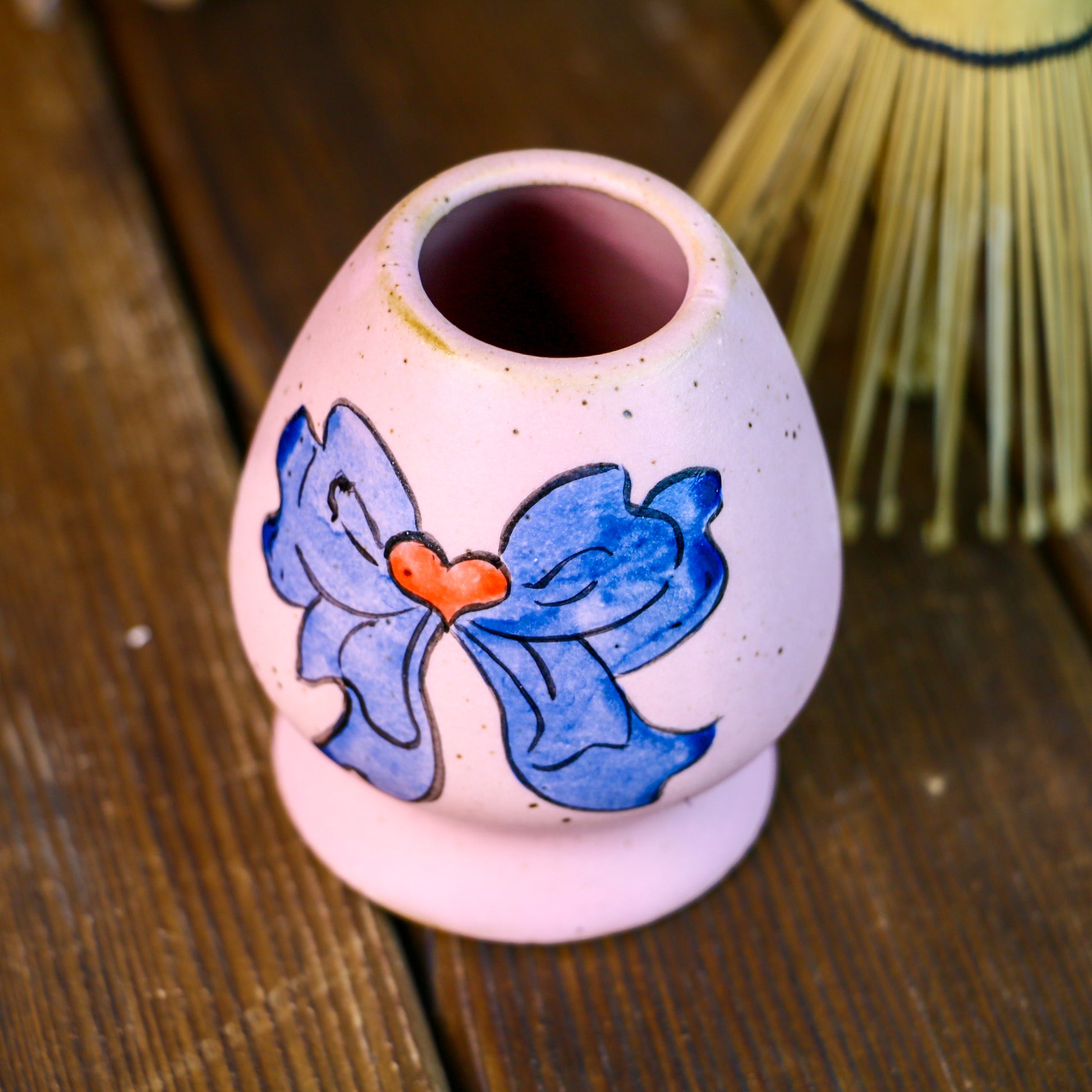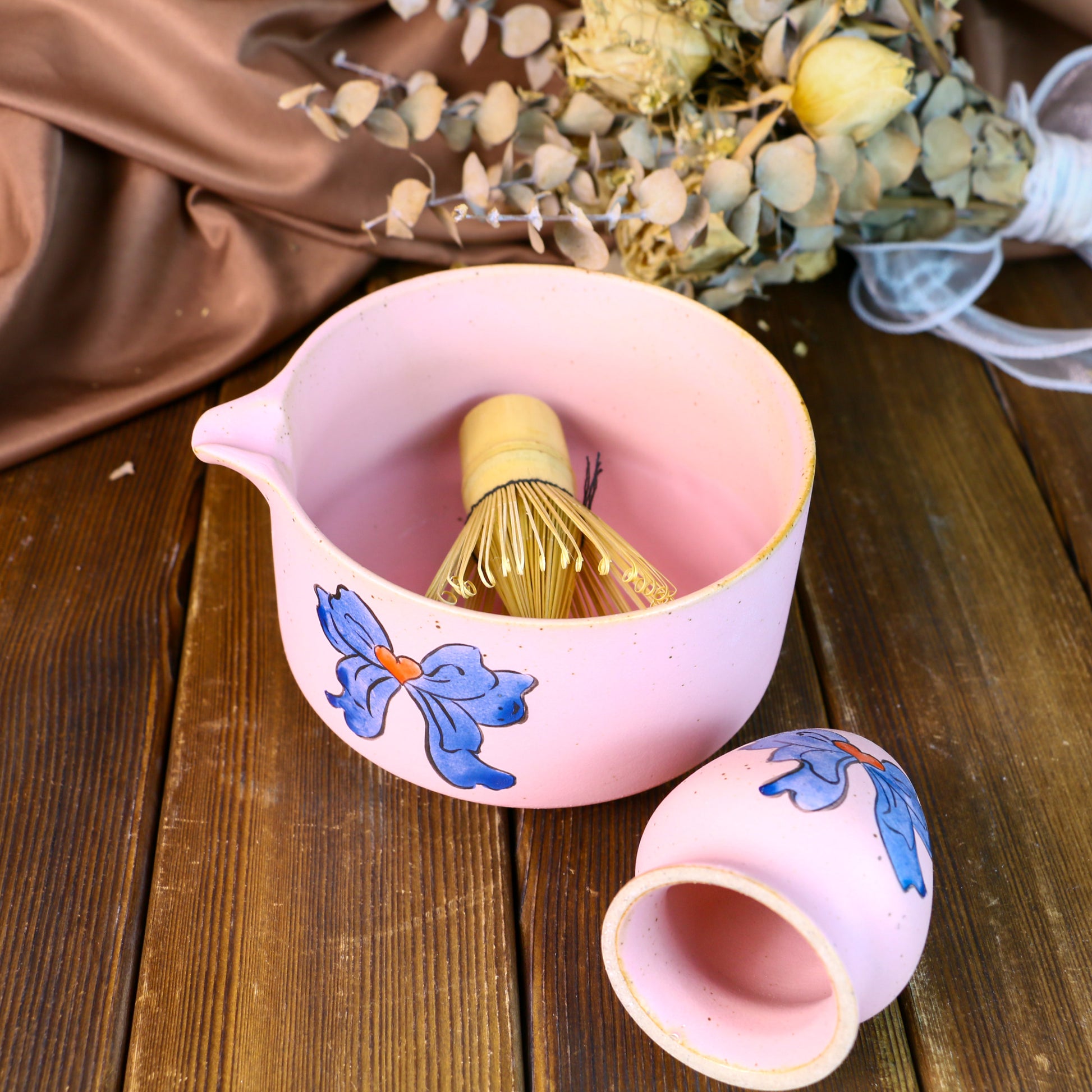 Handmade Ceramic Matcha Bowl Set with Hand-Painted Ribbon Details