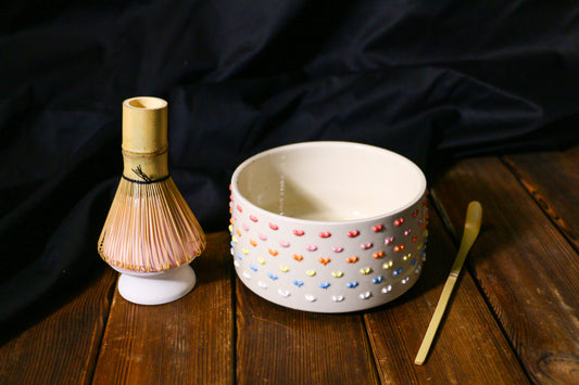 Kawaii Ceramic Matcha Bowl with Handmade 3D Colorful Hearts Design