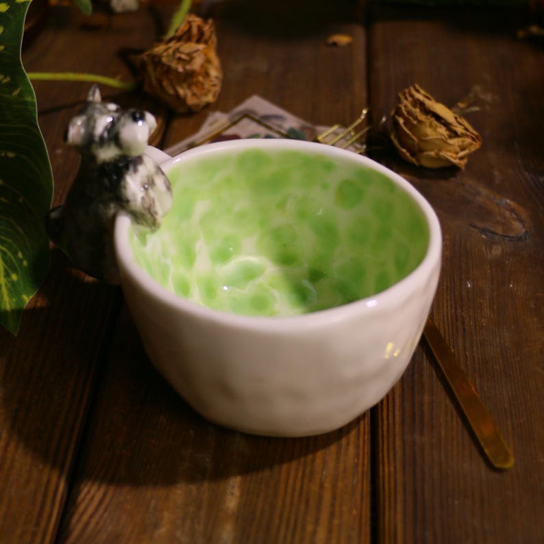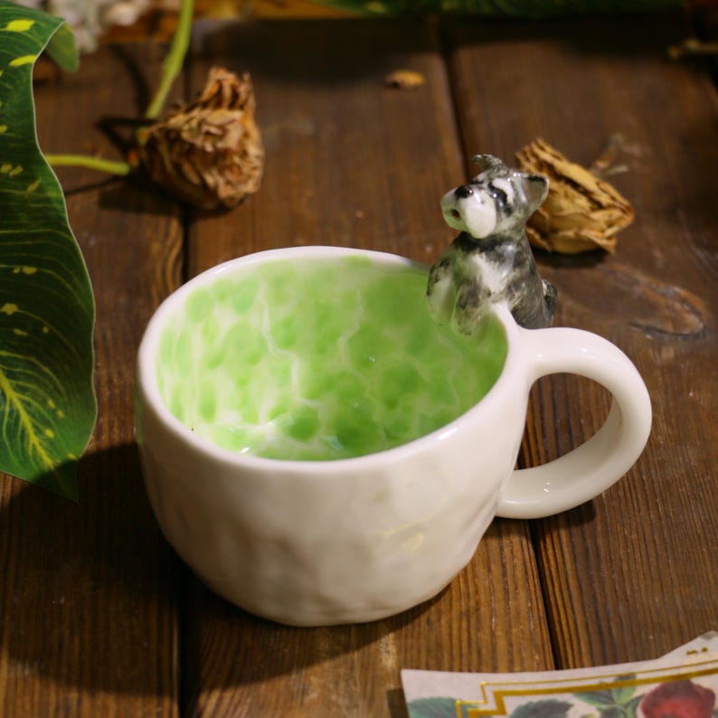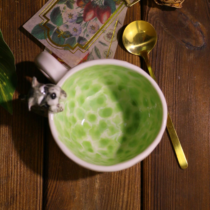 🐶 A custom 3D pet portrait playfully perched on the rim, "swimming" in a dreamy matcha-green swirl — each one carefully handmade from fine ceramic, celebrating the love you share with your furry friend.