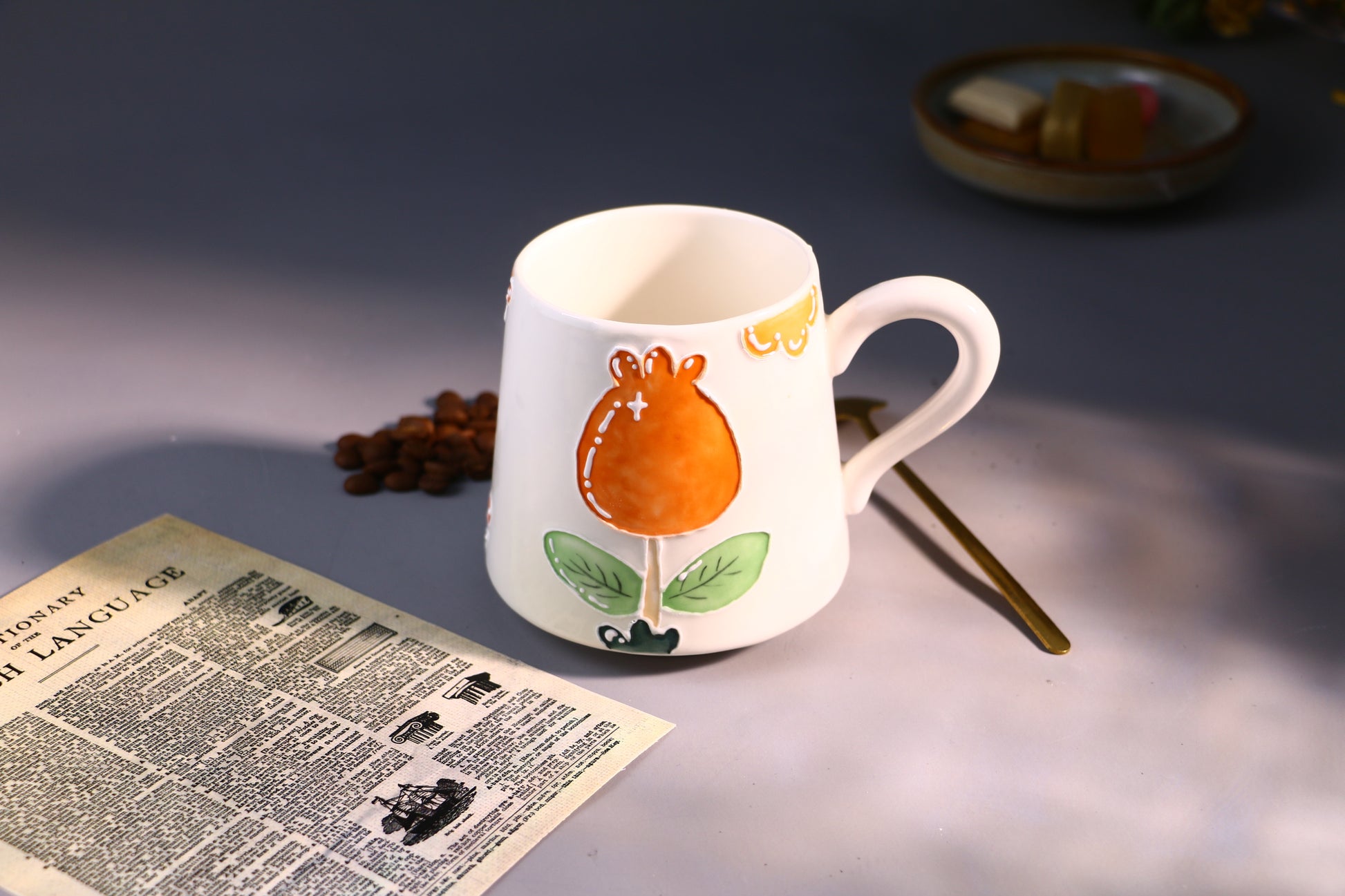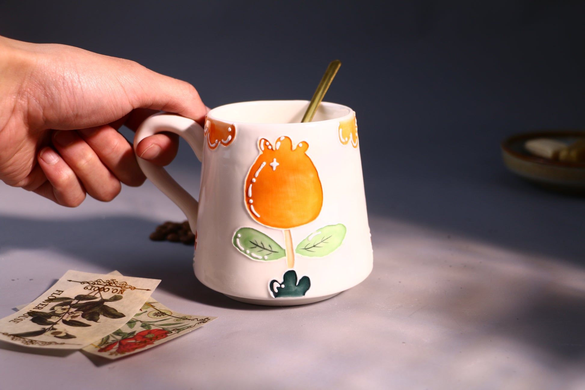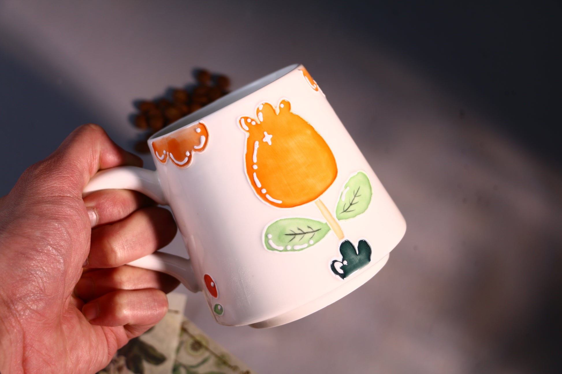 ๐ผ Brighten up your coffee time with this handcrafted ceramic mug, featuring a whimsical hand-painted floral design. The vibrant orange flower with lush green leaves adds a fresh, cheerful touch, while the curved handle and smooth ceramic finish create a comfortable, cozy feel. Whether you're sipping your morning coffee, evening tea, or just displaying it as part of your artisanal pottery collection, this cup brings warmth and charm to any setting.