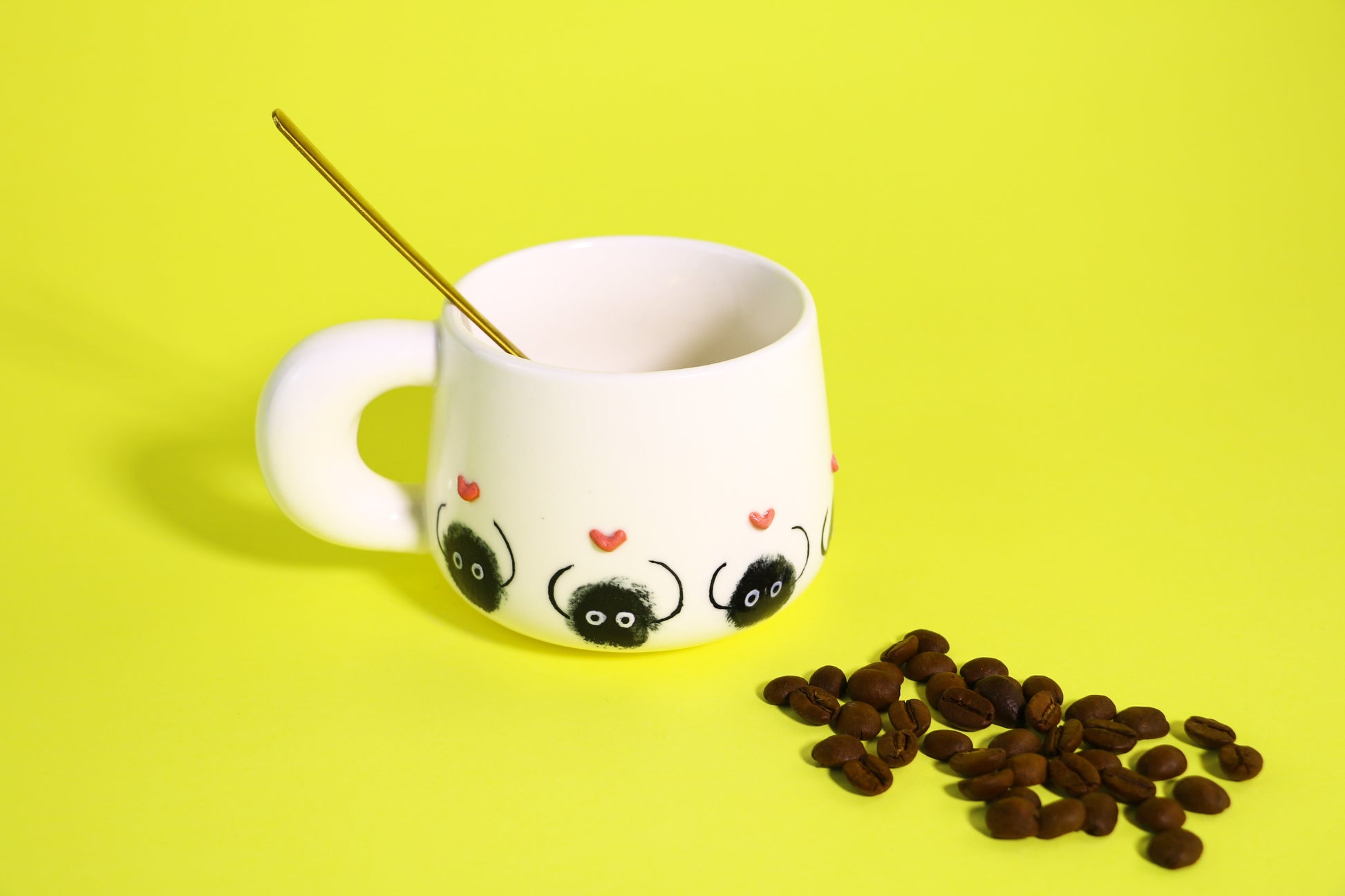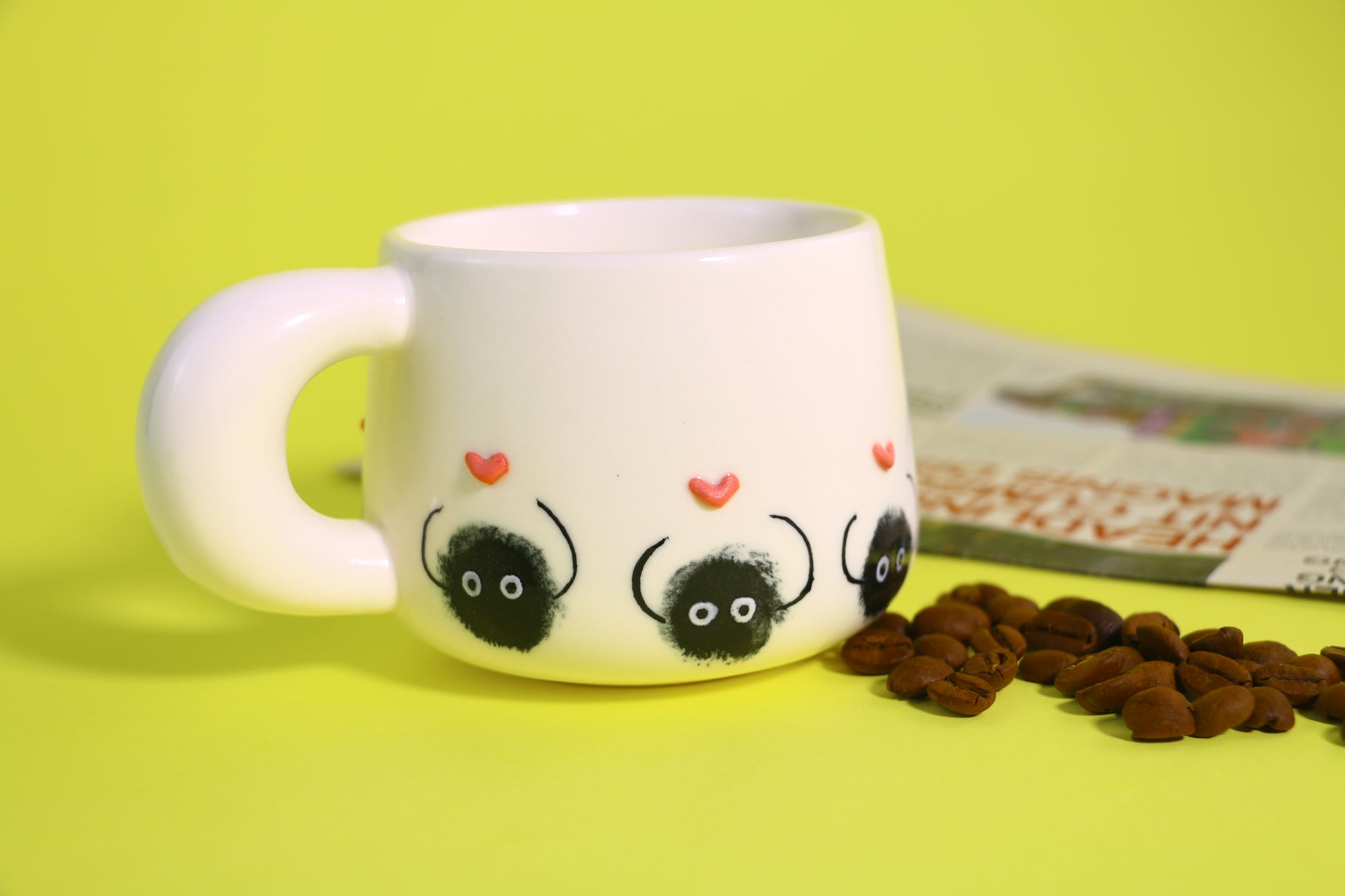 ☕ Start your morning with a little magic and whimsy! This handmade ceramic mug features a delightful hand-painted soot sprite design with tiny pink hearts, adding a playful and heartwarming touch to your daily coffee or tea routine. Its rounded handle and smooth ceramic glaze make it comfortable to hold, perfect for cozy moments. Whether you're enjoying a morning latte, an evening tea, or simply adding it to your collection, this cup brings joy to every sip.